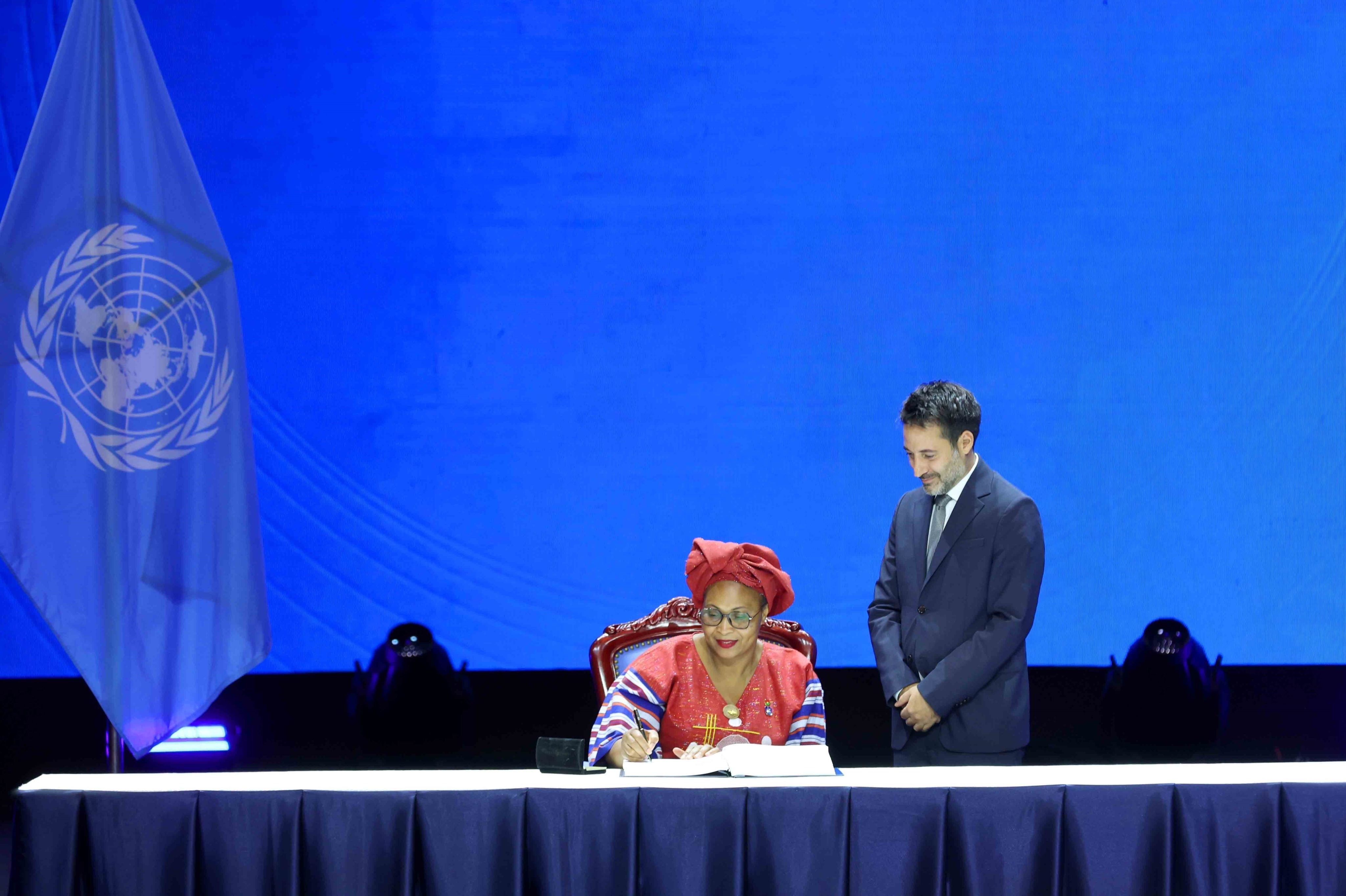 Bộ trưởng Thông tin, Hướng dẫn quốc gia và Truyền thông, Cộng hòa Uganda Chris Baryomunsi ký Công ước của Liên hợp quốc về Chống tội phạm mạng.
