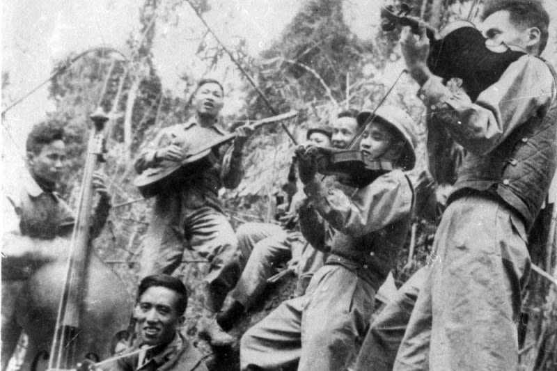 Các nhạc sĩ trong kháng chiến chống Pháp tập dượt biểu diễn. (Ảnh: Bảo tàng Lịch sử quốc gia)