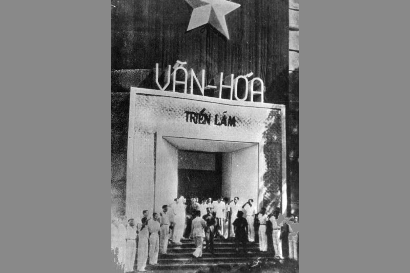 Các văn nghệ sĩ đón Chủ tịch Hồ Chí Minh đến dự triển lãm văn hóa tại Nhà Khai Trí-Tiến Đức, Hà Nội (góc phố Hàng Trống-Lê Thái Tổ hiện nay), ngày 7/10/1945. (Ảnh: Bảo tàng Lịch sử quốc gia)