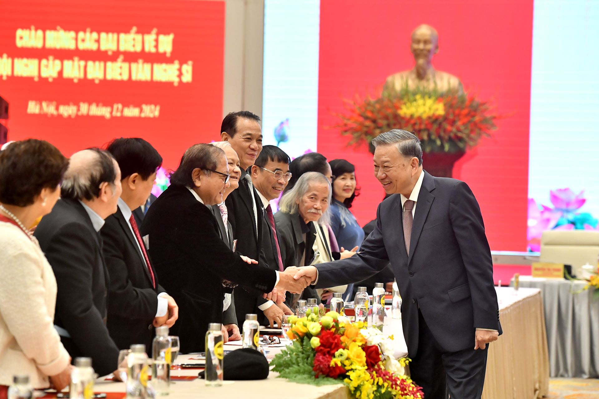 Nhân dịp năm mới 2025 và Xuân Ất Tỵ sắp tới, thay mặt Lãnh đạo Đảng, Nhà nước và nhân danh cá nhân, Tôi chúc tất cả các quý vị đại biểu, anh chị em văn nghệ sĩ cùng toàn thể các đồng chí mạnh khỏe, hạnh phúc, thành công.