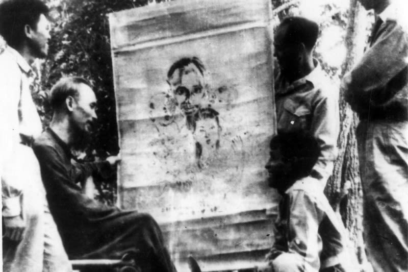 Chủ tịch Hồ Chí Minh xem bức tranh vẽ bằng máu "Bác Hồ với thiếu nhi Trung Nam Bắc" của họa sĩ Diệp Minh Châu do đoàn đại biểu Nam Bộ mang ra. (Ảnh: Bảo tàng Lịch sử quốc gia)