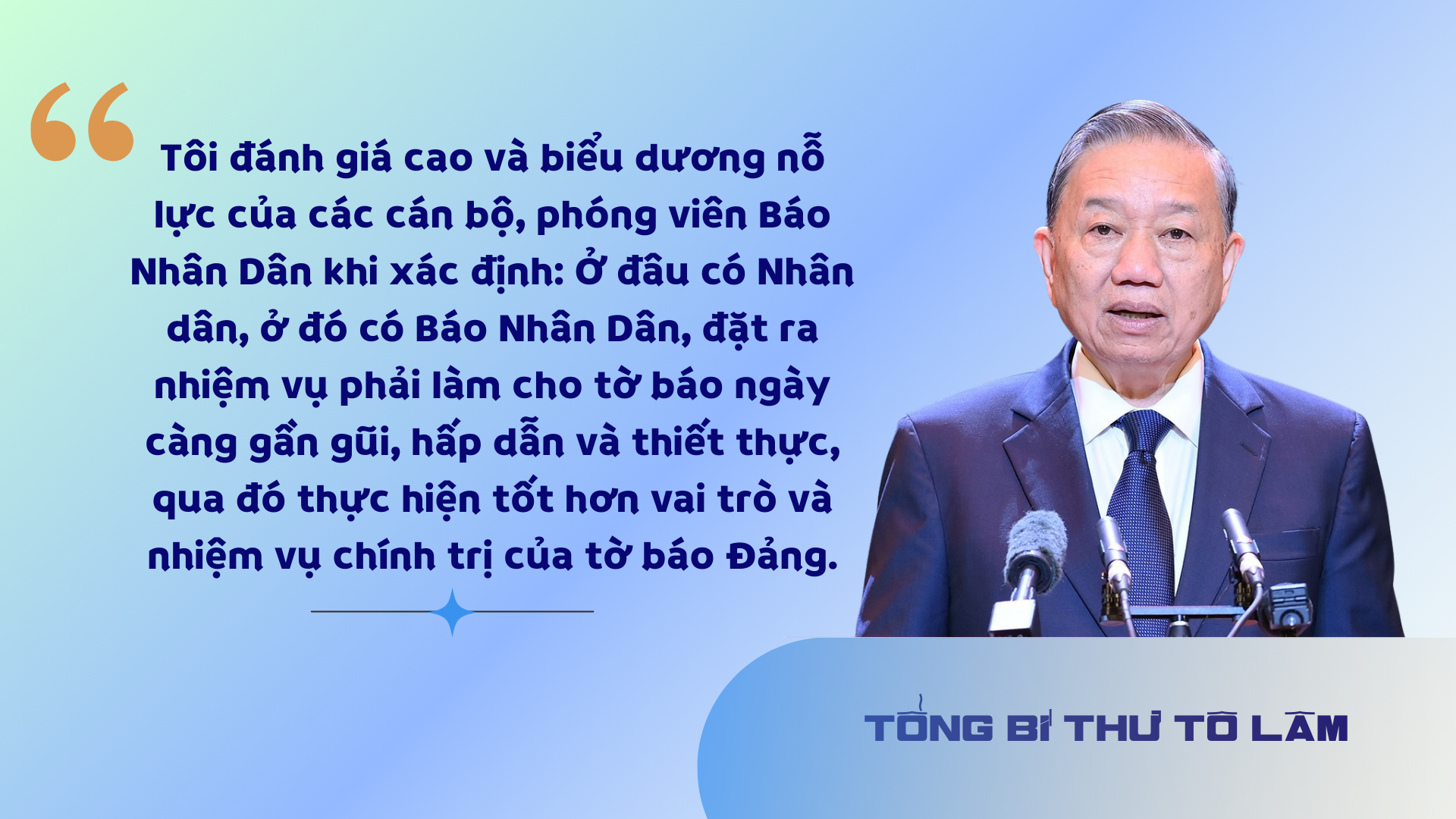 Tôi đánh giá cao và biểu dương nỗ lực của các cán bộ, phóng viên Báo Nhân Dân khi xác định: Ở đâu có Nhân dân, ở đó có Báo Nhân Dân, đặt ra nhiệm vụ phải làm cho tờ báo ngày càng gần gũi, hấp dẫn và thiết thực, qua đó thực hiện tốt hơn vai trò và nhiệm vụ chính trị của tờ báo Đảng. Các phụ trương của Báo trong các đợt tuyên truyền kỷ niệm 70 năm Chiến thắng Điện Biên Phủ, 50 năm Ngày Giải phóng hoàn toàn miền nam, thống nhất đất nước, 80 năm Cách mạng Tháng Tám thành công và Quốc khánh 2/9, Triển lãm 95 năm cờ Đảng soi đường, các hình thức tuyên truyền phong phú, hiệu quả về Đại hội XIV của Đảng và Chương trình nghệ thuật chính luận Tổ quốc trong tim gây tiếng vang trong dư luận, góp phần khơi dậy chiều sâu lịch sử, hun đúc niềm tự hào dân tộc, khẳng định niềm tin sâu sắc của nhân dân vào đường lối, chủ trương của Đảng là những minh chứng cho thấy các đồng chí đã rất nỗ lực và cố gắng. Qua đó, đội ngũ những người làm Báo Nhân Dân ngày càng trưởng thành, luôn giữ vững phẩm chất chính trị, đạo đức nghề nghiệp, trách nhiệm xã hội và tinh thần phụng sự Tổ quốc, phục vụ Nhân dân; trình độ nghiệp vụ chuyên môn, trình độ sử dụng các công nghệ làm báo hiện đại ngày càng được nâng lên.