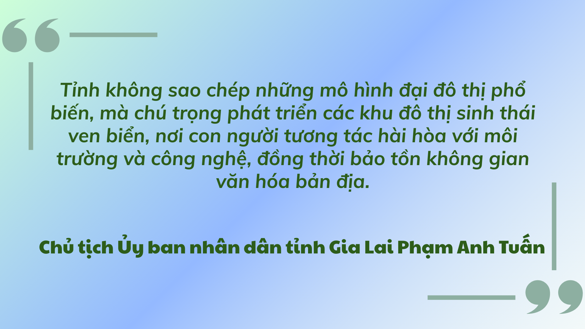 Chủ tịch Ủy ban nhân dân tỉnh Gia Lai Phạm Anh Tuấn cho biết, tỉnh không sao chép những mô hình đại đô thị phổ biến, mà chú trọng phát triển các khu đô thị sinh thái ven biển, nơi con người tương tác hài hòa với môi trường và công nghệ, đồng thời bảo tồn không gian văn hóa bản địa.