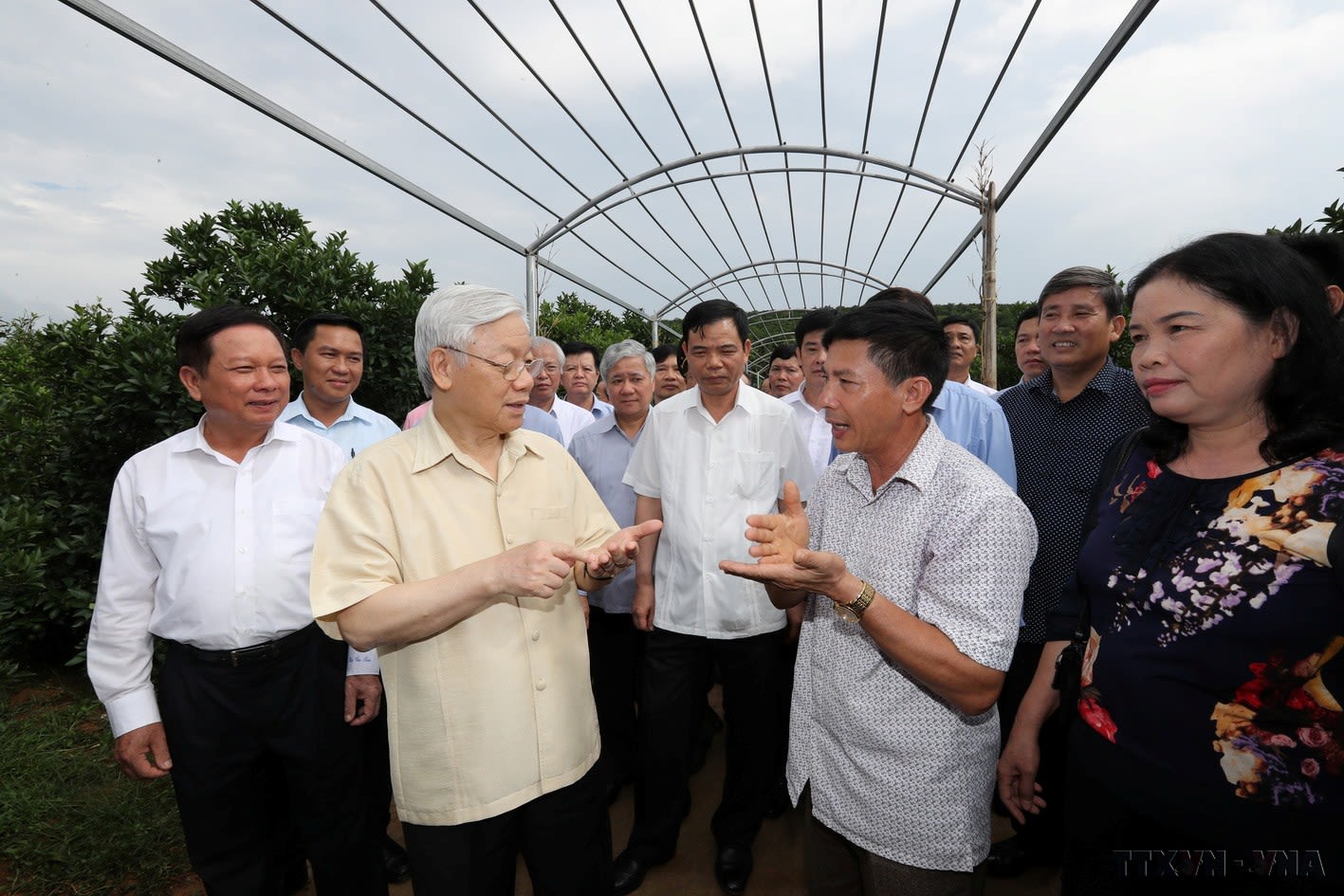 Tổng Bí thư Nguyễn Phú Trọng thăm mô hình trồng cam ở khu 6, thị trấn huyện Cao Phong. Ảnh: Trí Dũng – TTXVN
