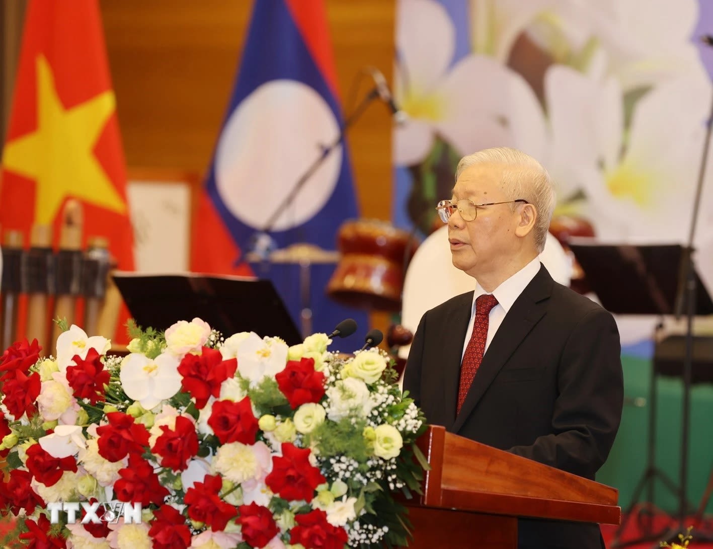 Tổng Bí thư Nguyễn Phú Trọng đọc Diễn văn tại Lễ kỷ niệm 60 năm Ngày thiết lập quan hệ ngoại giao Việt Nam-Lào, ngày 18/7/2022. (Ảnh: Trí Dũng/TTXVN)