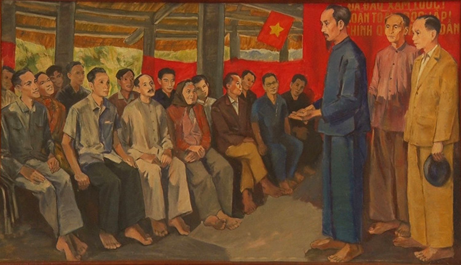 Chủ tịch Hồ Chí Minh nói chuyện với đại biểu Quốc dân Đại hội tại Đình Tân Trào (Tranh sơn dầu: Họa sĩ Cao Thương). (Ảnh tư liệu)