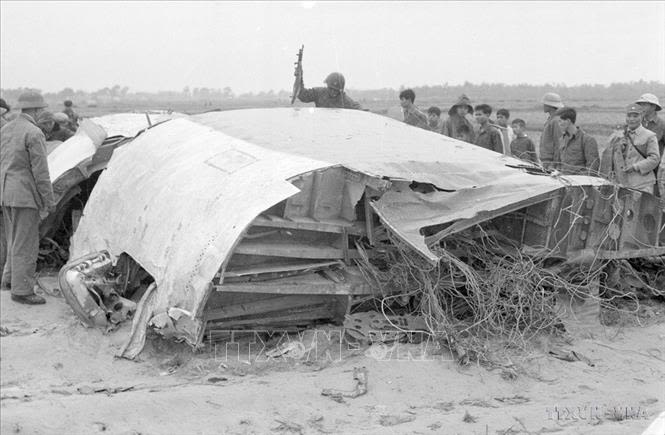 Xác của 1 trong những chiếc máy bay ném bom B-52 bị quân và dân Hà Nội bắn rơi đêm 18, rạng sáng 19/12/1972, mở màn cho Chiến thắng Hà Nội – Điện Biên Phủ trên không (Ảnh: Tư liệu TTXVN)