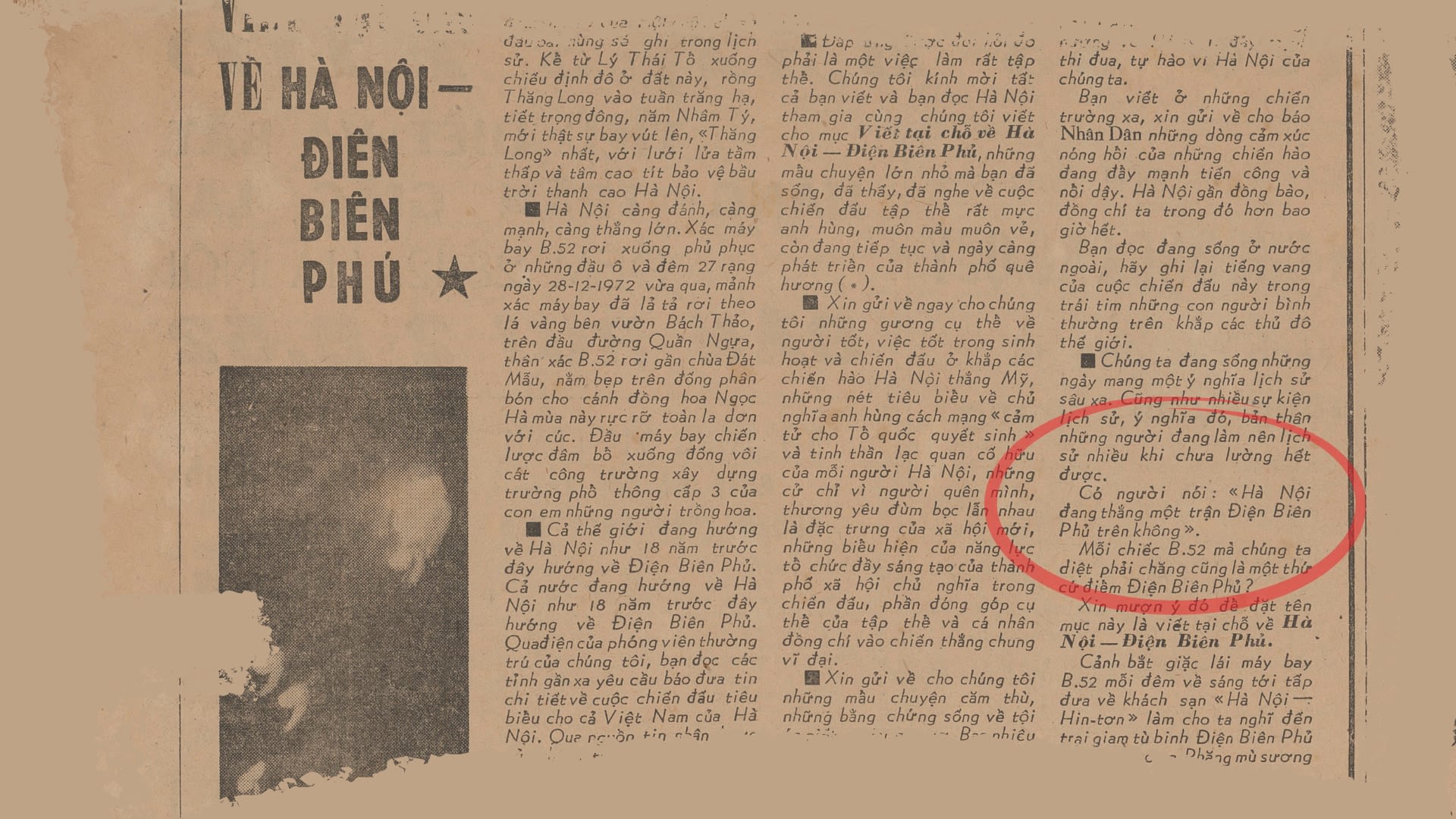 “Cụm từ “Hà Nội – Điện Biên Phủ trên không” đã xuất hiện lần đầu trên Báo Nhân Dân, số báo đăng ngày 29/12/1972. Và từ đó, trở thành tên gọi cho Chiến dịch Hà Nội 12 ngày đêm bắn rơi máy bay B-52 của Mỹ, như một biểu tượng của chiến thắng hào hùng và những ngày đêm khói lửa không thể nào quên…”