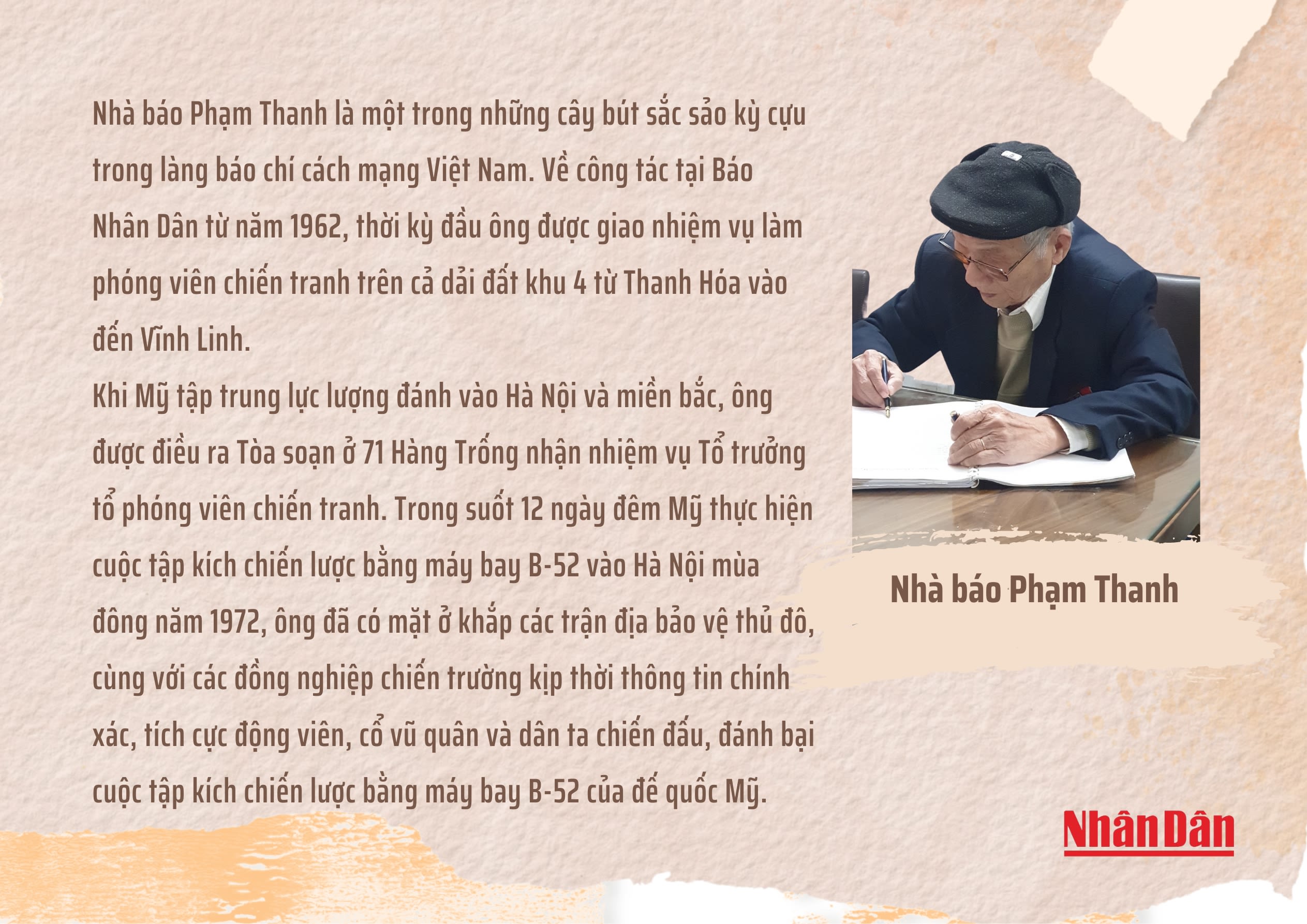 Nhà báo lão thành Phạm Thanh, nay đã ở tuổi ngoài 90, chia sẻ với phóng viên báo Nhân Dân về ký ức làm báo 12 ngày đêm mùa đông 1972 lịch sử…