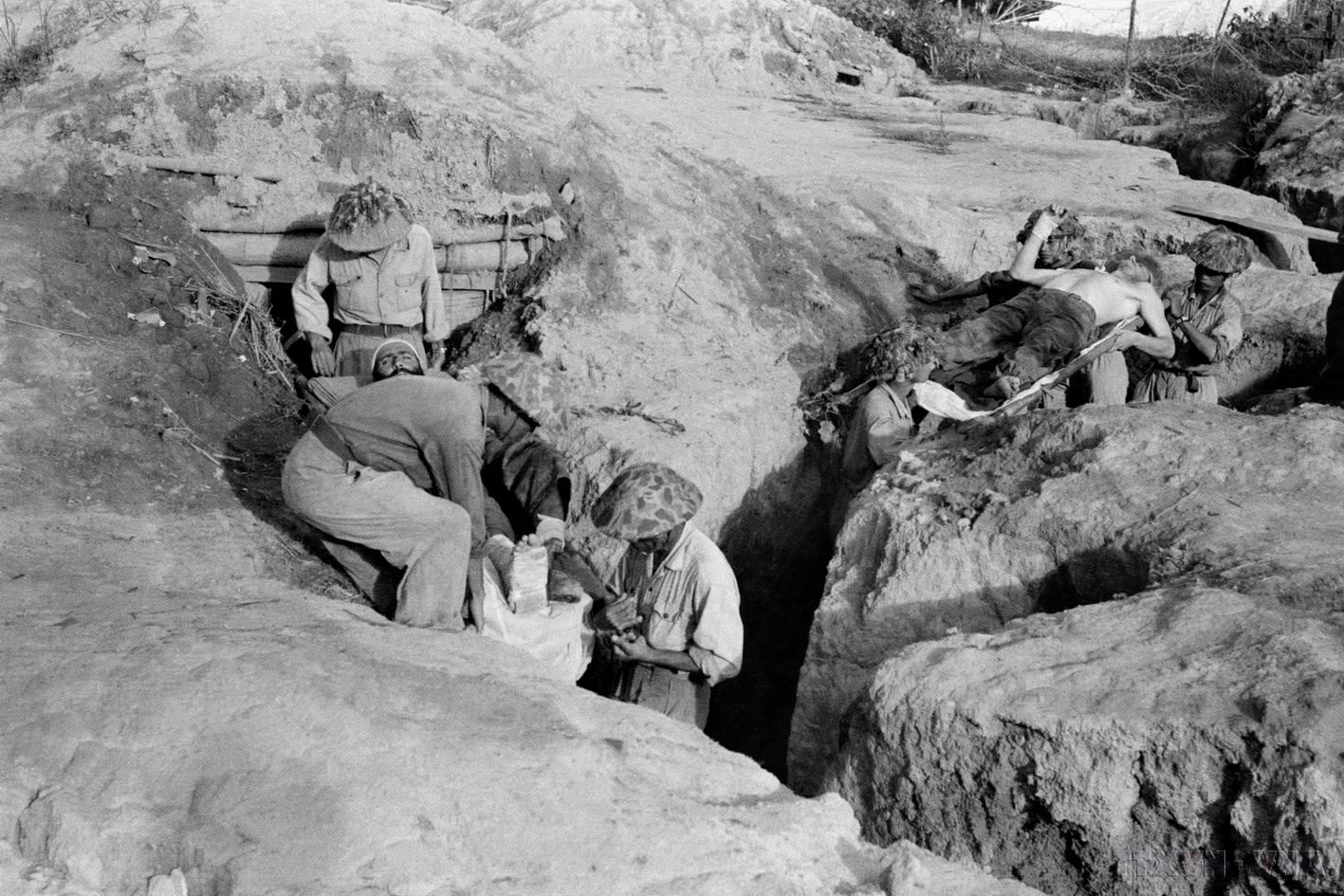 Cán bộ quân y của ta đang cứu chữa bọn thương binh địch trong các hầm ngầm.
