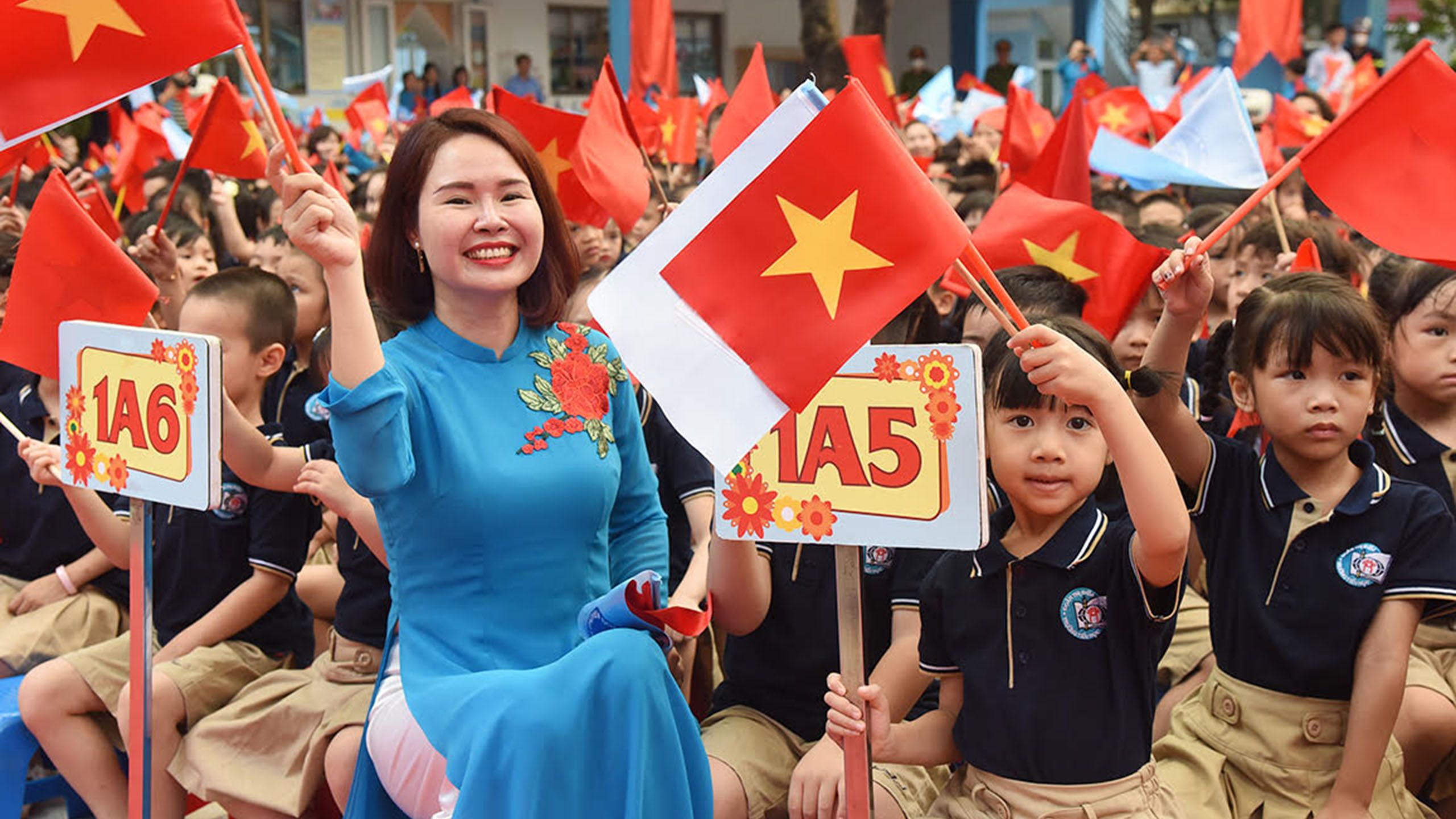Các cháu ngồi dưới sân trường, dưới lá cờ Tổ quốc, trong những bộ quần áo đồng phục rất đẹp đang rất vui và tự hào được học ở ngôi trường mang tên Hồng Hà nữ sĩ Đoàn Thị Điểm đúng không nhỉ? Các cháu là những nhân vật quan trọng trong Lễ khai giảng hôm nay. Bác muốn các cháu dành một tràng pháo tay thật lớn để cảm ơn bố mẹ, ông bà đã dậy sớm, chuẩn bị quần áo và đưa các cháu đến trường hôm nay; cảm ơn thầy cô đã ân cần dẫn các con vào lớp và sẽ tiếp tục hành trình dạy dỗ, chăm sóc các cháu. Có lẽ với các cháu lớp 1, đây là ngày đầu tiên đầy bỡ ngỡ được gặp thầy cô, bạn bè và nhà trường. Hành trang, kỷ niệm của tuổi thơ sẽ chắp cánh theo các cháu suốt cuộc đời.