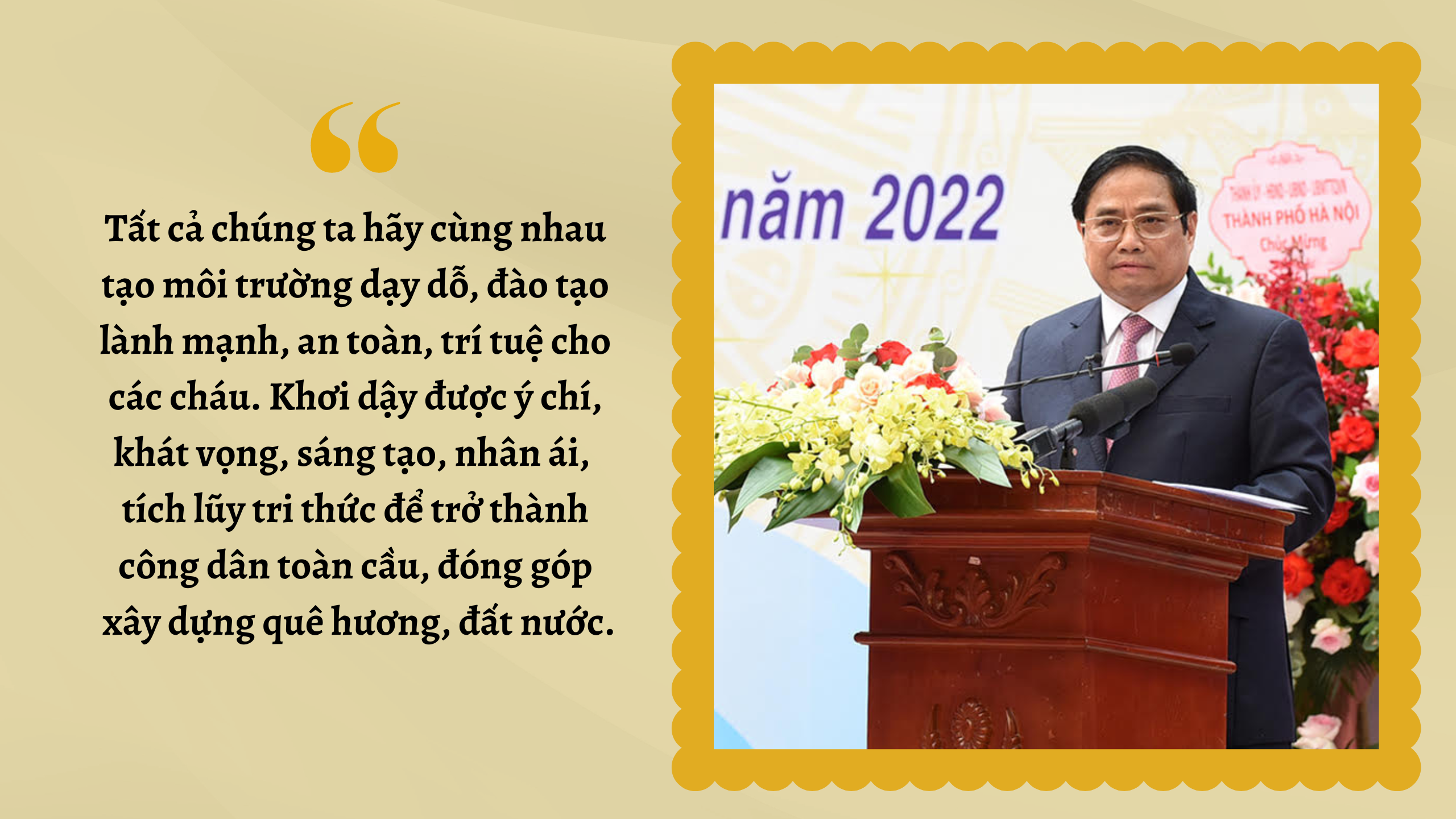 Chúng ta đừng vì bệnh thành tích, áp đặt mà làm tổn thương con trẻ. Chúng ta dạy các cháu hình thành nhân cách về tình yêu thương, trung thực, lòng nhân ái, sự nỗ lực, sống có lý tưởng, học cách vươn lên từ khó khăn, gian khổ, tự lực, tự cường... trên nguyên tắc tôn trọng sự khác biệt của mỗi cháu, khuyến khích sự sáng tạo, tìm hiểu, tiếp thu tri thức dân tộc và nhân loại, tư duy phản biện, khát vọng cống hiến...