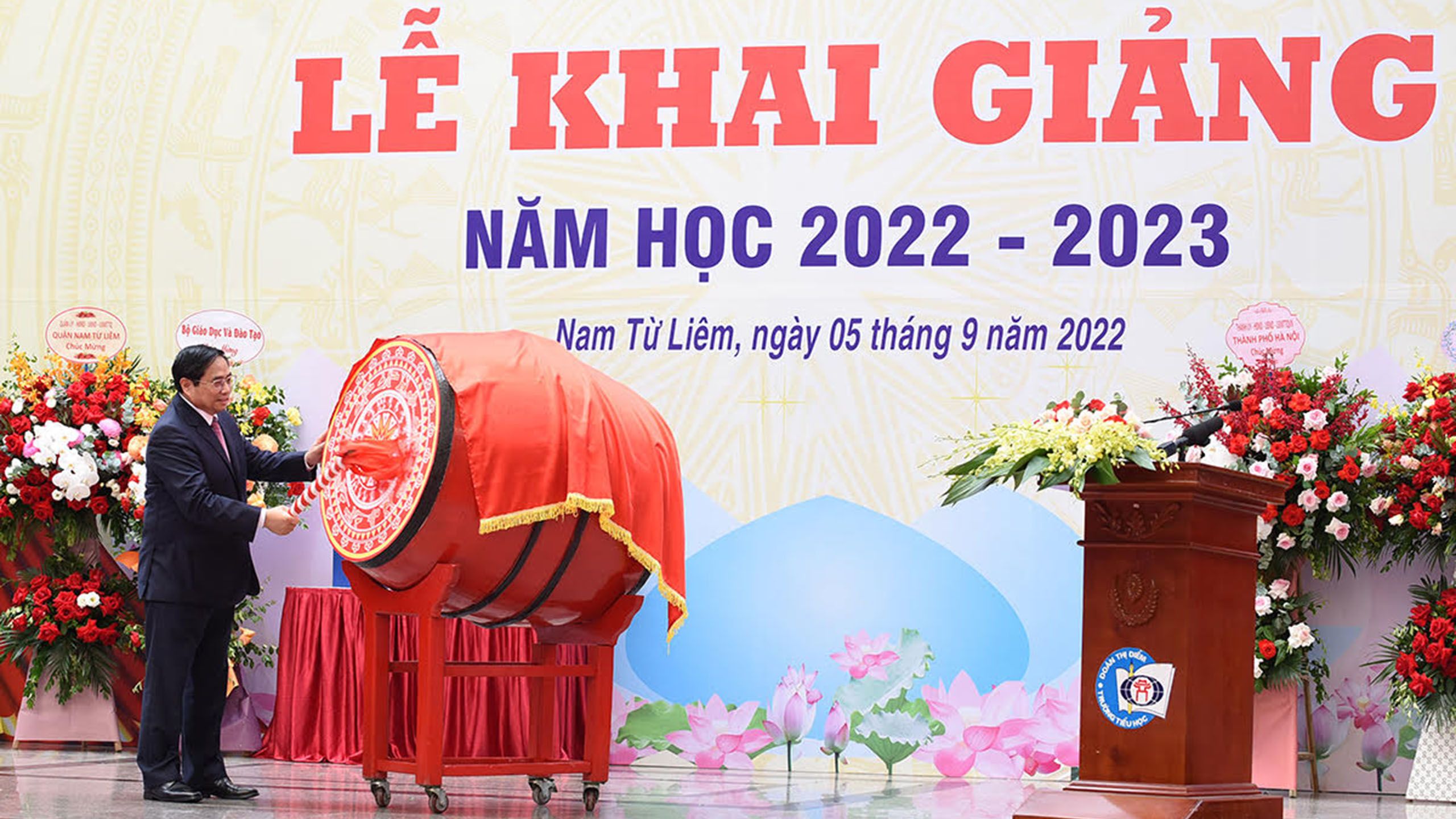 Thủ tướng Phạm Minh Chính đánh trống khai giảng năm học mới tại Trường Tiểu học Đoàn Thị Điểm.