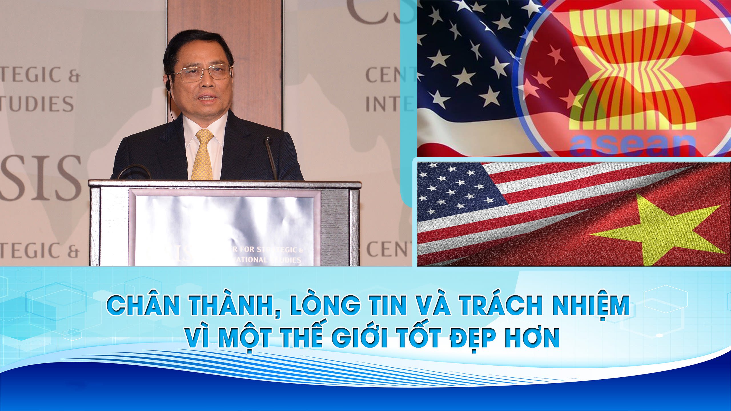 Chiều 11/5 (giờ địa phương), tại Thủ đô Washington D.C, Thủ tướng Phạm Minh Chính đã đến thăm Trung tâm Nghiên cứu Chiến lược và Quốc tế Hoa Kỳ (CSIS) và có bài phát biểu quan trọng với chủ đề "Chân thành, lòng tin và trách nhiệm vì một thế giới tốt đẹp hơn". Báo Nhân Dân trân trọng giới thiệu toàn văn bài phát biểu.