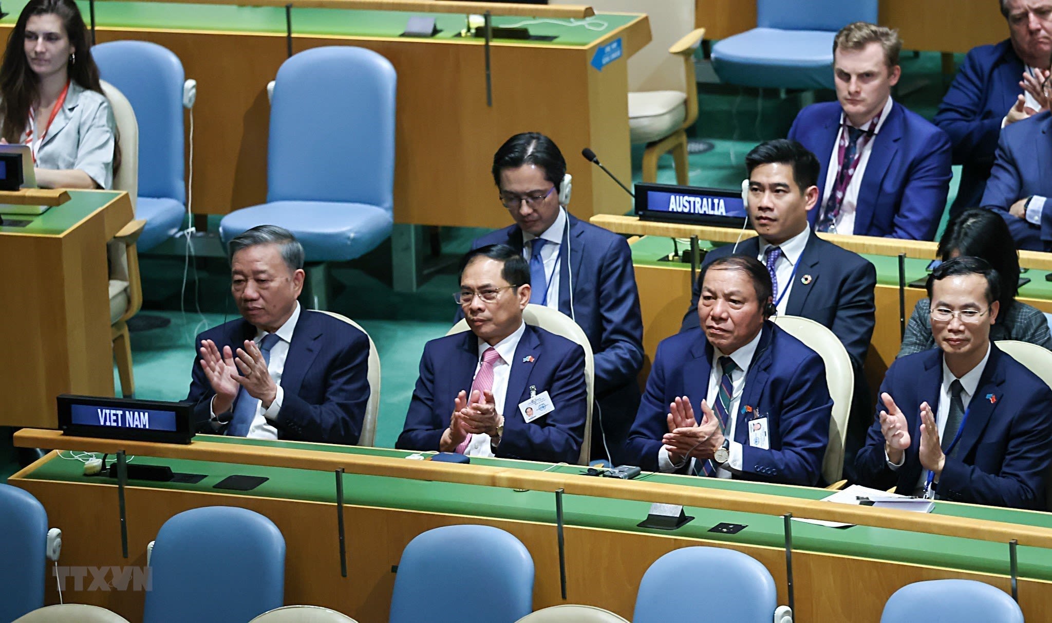 Đoàn Việt Nam tham dự Phiên thảo luận chung cấp cao Khóa 78 Đại Hội đồng Liên hợp quốc. (Ảnh: Dương Giang/TTXVN)
