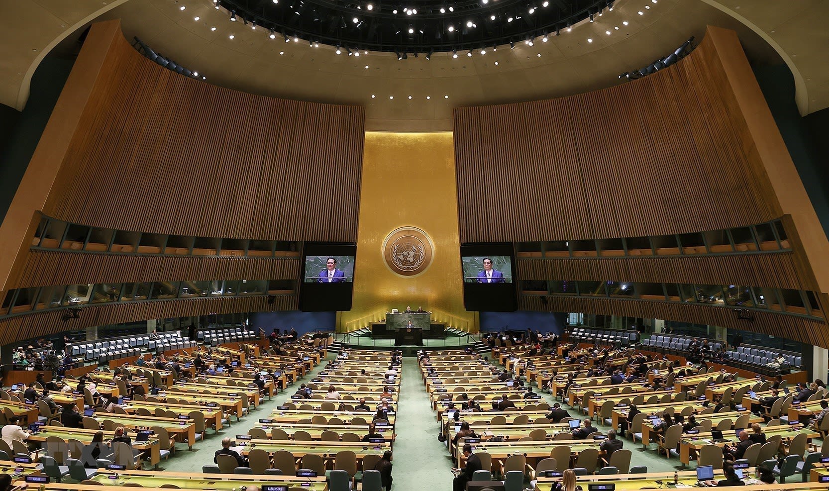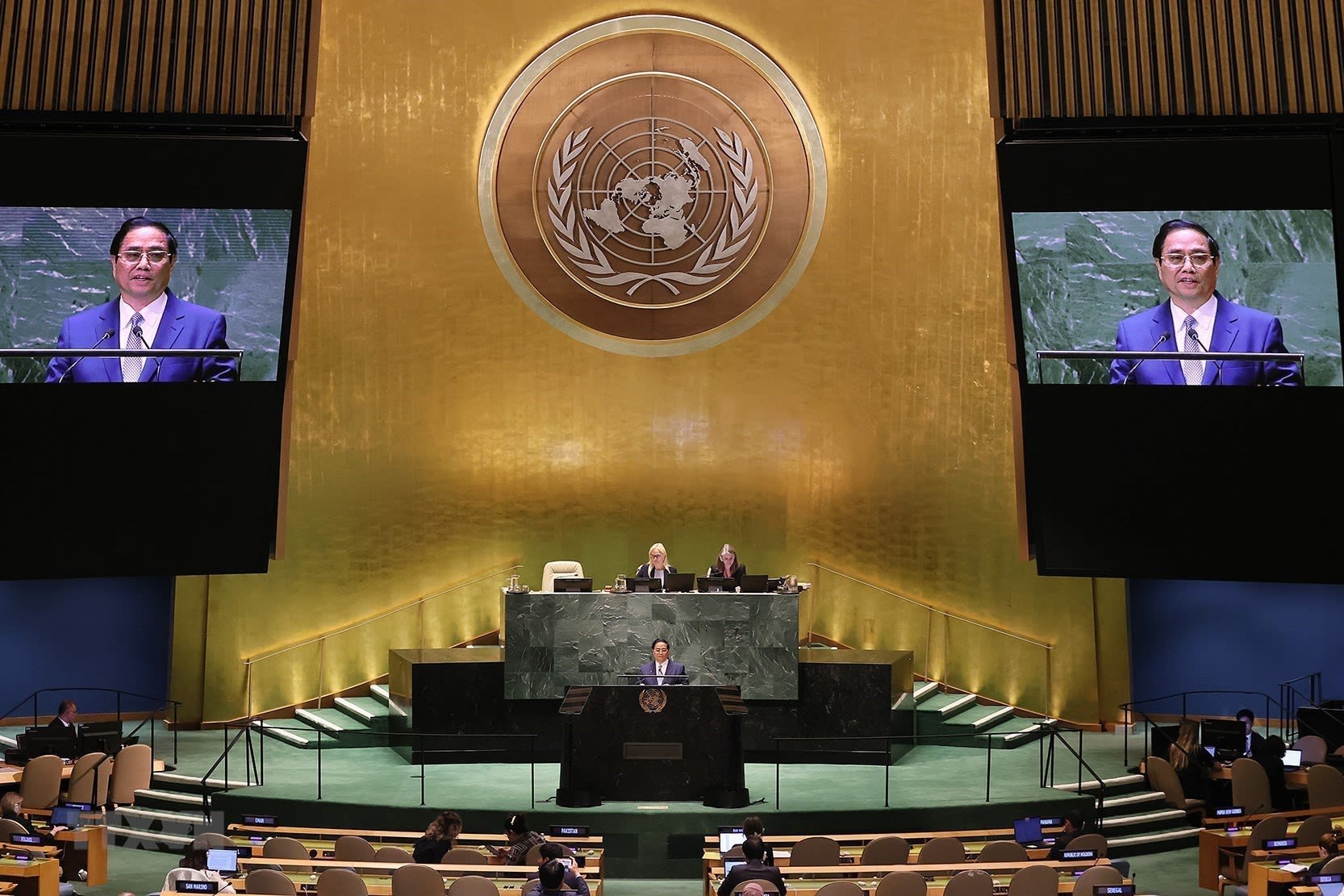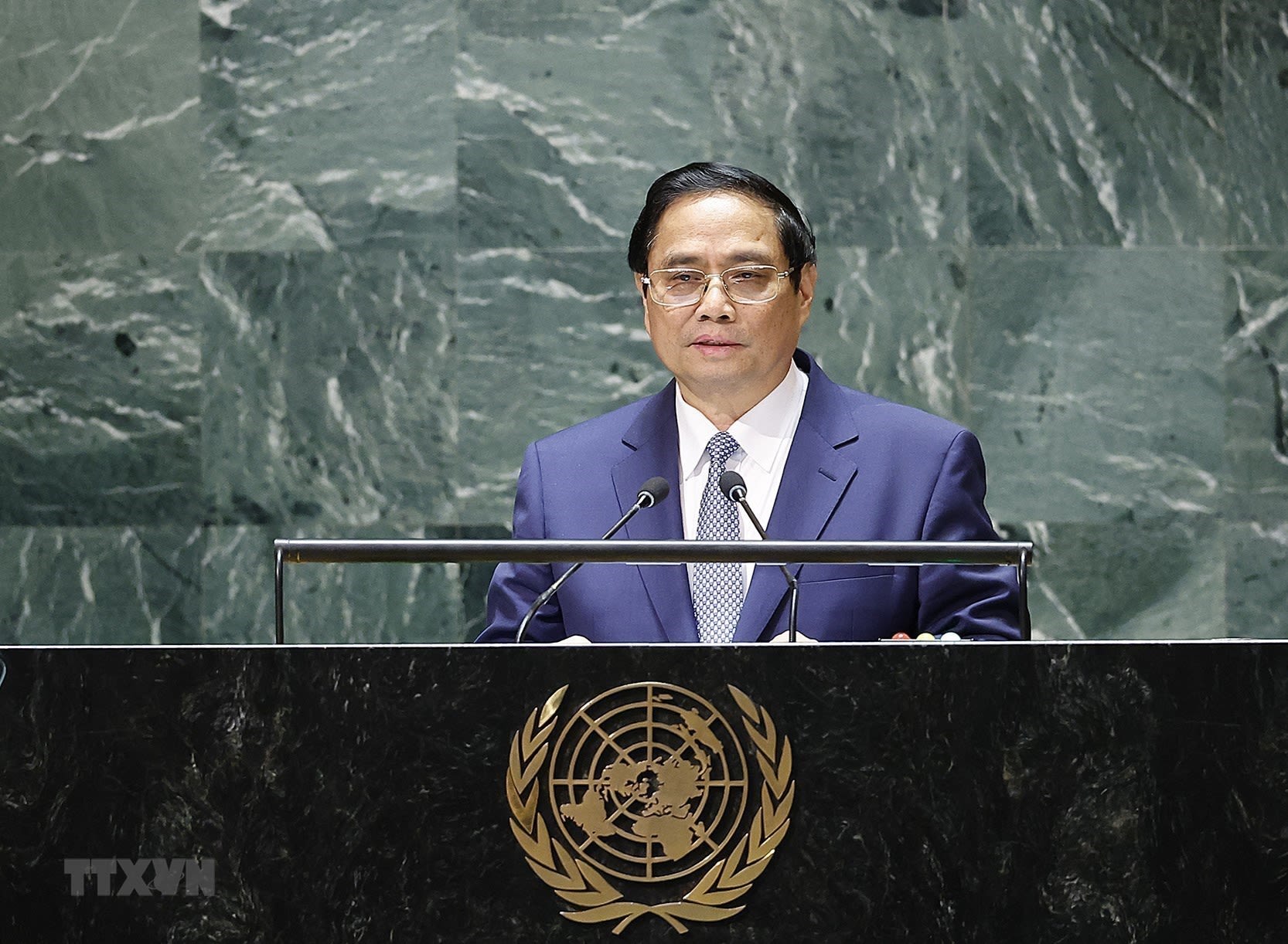 Thủ tướng Phạm Minh Chính phát biểu tại Phiên thảo luận chung cấp cao Khóa 78 Đại Hội đồng Liên hợp quốc. (Ảnh: Dương Giang/TTXVN)