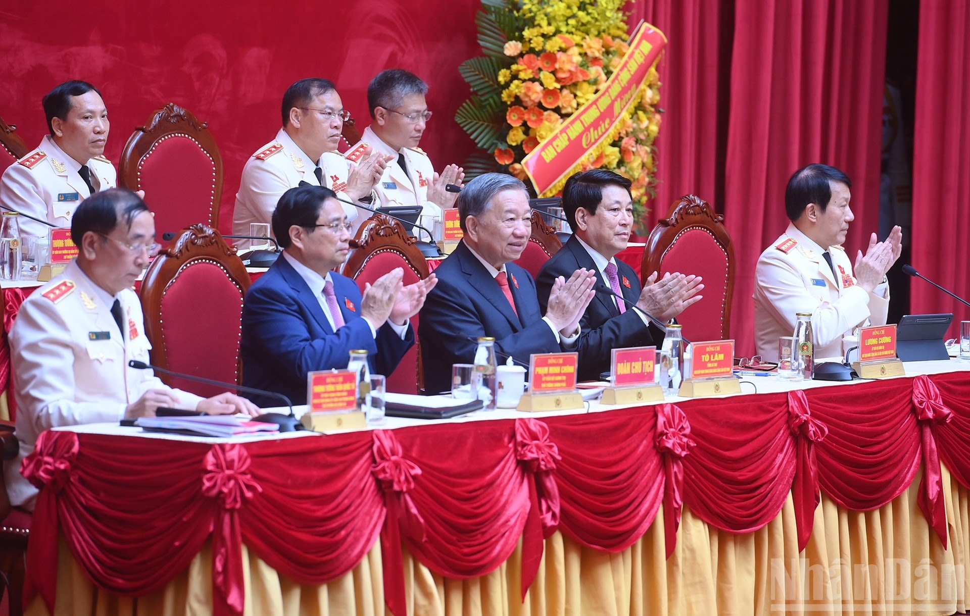 Tổng Bí thư Tô Lâm, Chủ tịch nước Lương Cương, Thủ tướng Phạm Minh Chính và các đồng chí trong Đoàn Chủ tịch điều hành đại hội.