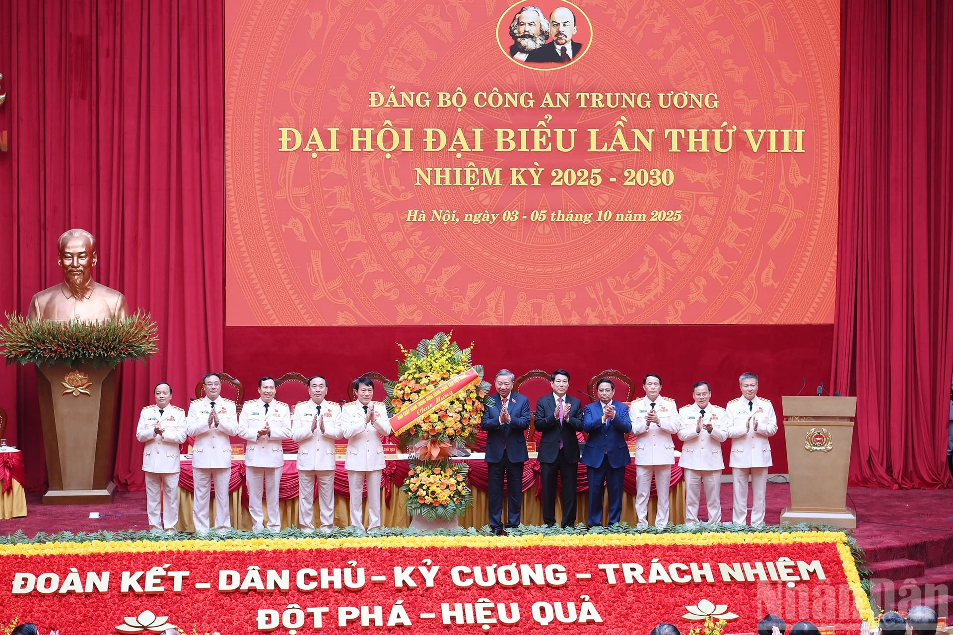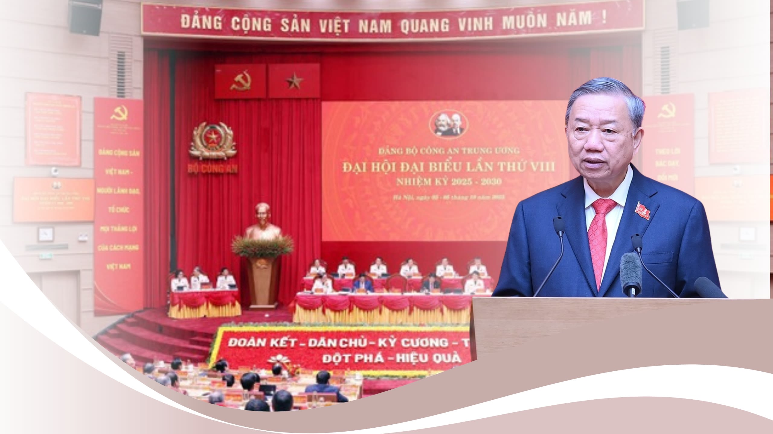Với truyền thống 80 năm xây dựng, chiến đấu và trưởng thành, những cống hiến, đóng góp của lực lượng Công an nhân dân với sự nghiệp cách mạng của Đảng, của dân tộc, với sự phát triển của đất nước là rất to lớn. Đảng, Nhà nước và nhân dân cả nước luôn tự hào về lực lượng Công an nhân dân với niềm tin yêu sâu sắc; tin tưởng vào bản lĩnh, trách nhiệm, ý chí của toàn lực lượng trong bảo vệ Đảng, bảo vệ chế độ xã hội chủ nghĩa, bảo vệ nhân dân, bảo vệ an ninh, trật tự, coi Công an nhân dân là lực lượng quan trọng bảo đảm thực hiện thắng lợi Nghị quyết Đại hội lần thứ XIV của Đảng và các chủ trương chiến lược của Đảng trong kỷ nguyên phát triển mới của đất nước. Tôi tin tưởng chắc chắn rằng, Đại hội đại biểu Đảng bộ Công an Trung ương lần thứ VIII sẽ là Đại hội tiêu biểu, kiểu mẫu, tập trung trí tuệ, phát huy truyền thống anh hùng vẻ vang, khẳng định quyết tâm thực hiện thắng lợi nghị quyết Đại hội, tiếp tục tạo ra những kỳ tích mới, chiến công mới, đáp ứng sự tin cậy, kỳ vọng của Đảng, Nhà nước và nhân dân đối với Công an nhân dân.