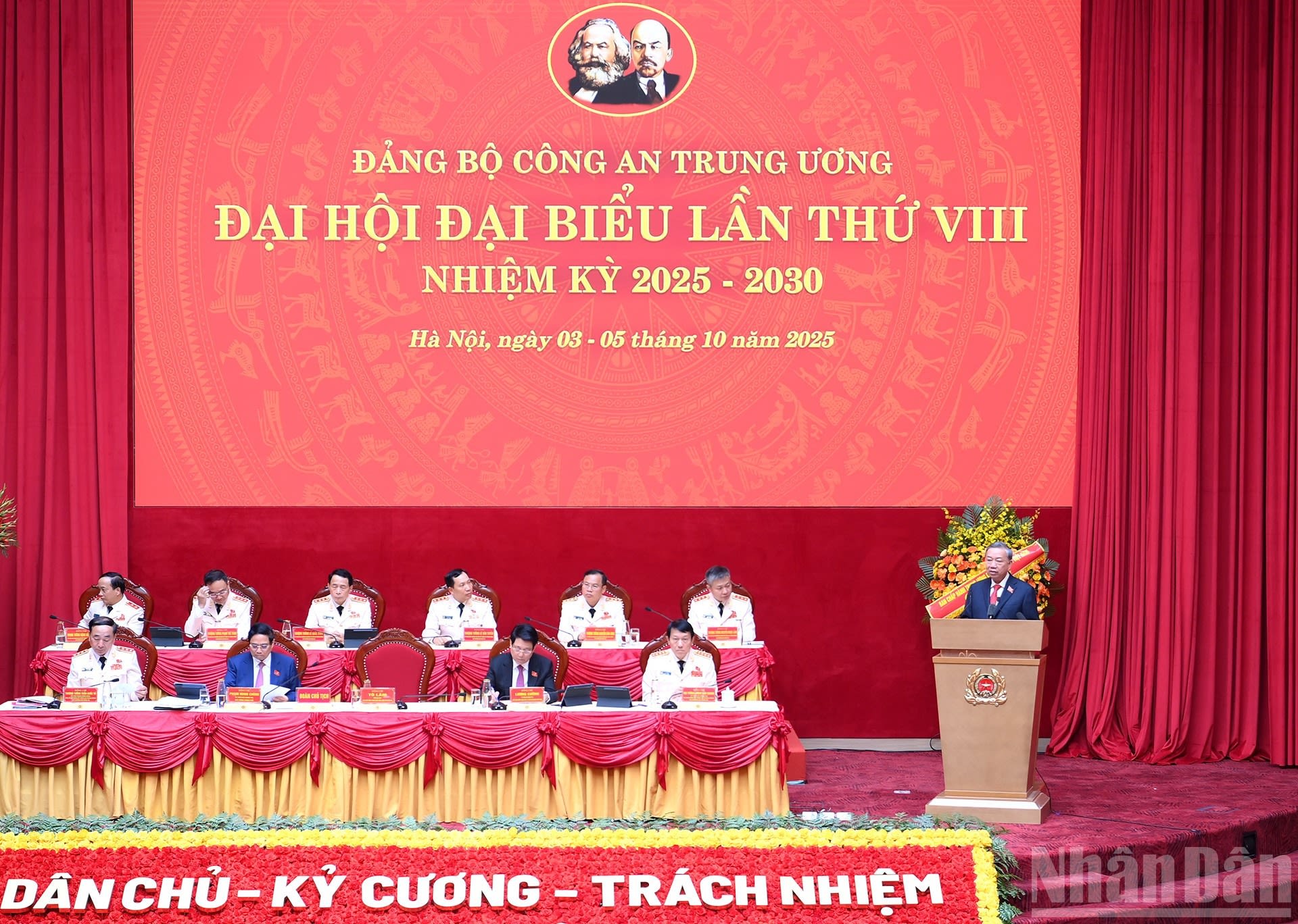 Sáng 4/10, tại Hà Nội, Tổng Bí thư Tô Lâm cùng các đồng chí lãnh đạo, nguyên lãnh đạo Đảng, Nhà nước dự khai mạc Đại hội đại biểu Đảng bộ Công an Trung ương lần thứ VIII, nhiệm kỳ 2025-2030. Báo Nhân Dân trân trọng giới thiệu bài phát biểu chỉ đạo của Tổng Bí thư Tô Lâm tại đại hội.