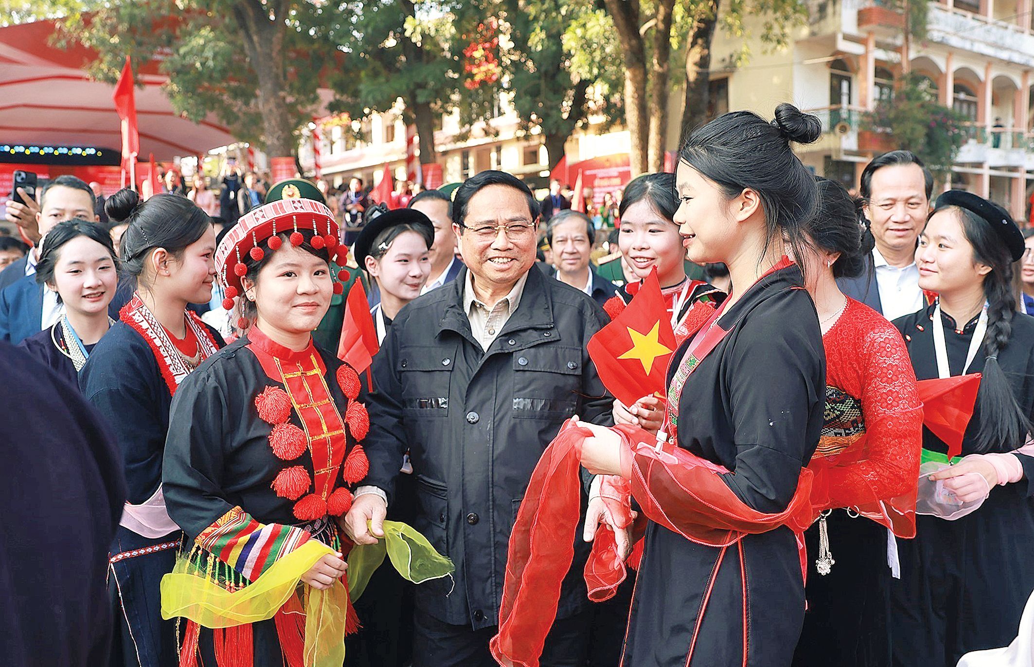 Thủ tướng Phạm Minh Chính với học sinh Trường phổ thông vùng cao Việt Bắc, Thái Nguyên. (Ảnh: Dương Giang/TTXVN)