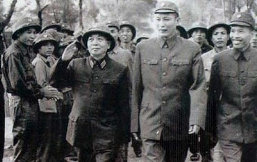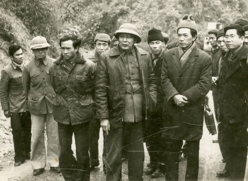 Đại tướng Võ Nguyên Giáp cùng Tư lệnh Binh đoàn Trường Sơn Đồng Sỹ Nguyên đến thăm bộ đội Trường Sơn.