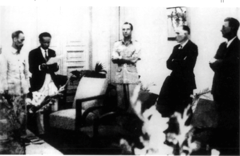 Chủ tịch Hồ Chí Minh và G.Xanhtơni (đứng giữa) đại diện Chính phủ Pháp cùng đại diện các nước Đồng minh nghe đọc văn bản Hiệp định sơ bộ ngày 6/3/1946 trước khi ký kết (Hà Nội, 1946).