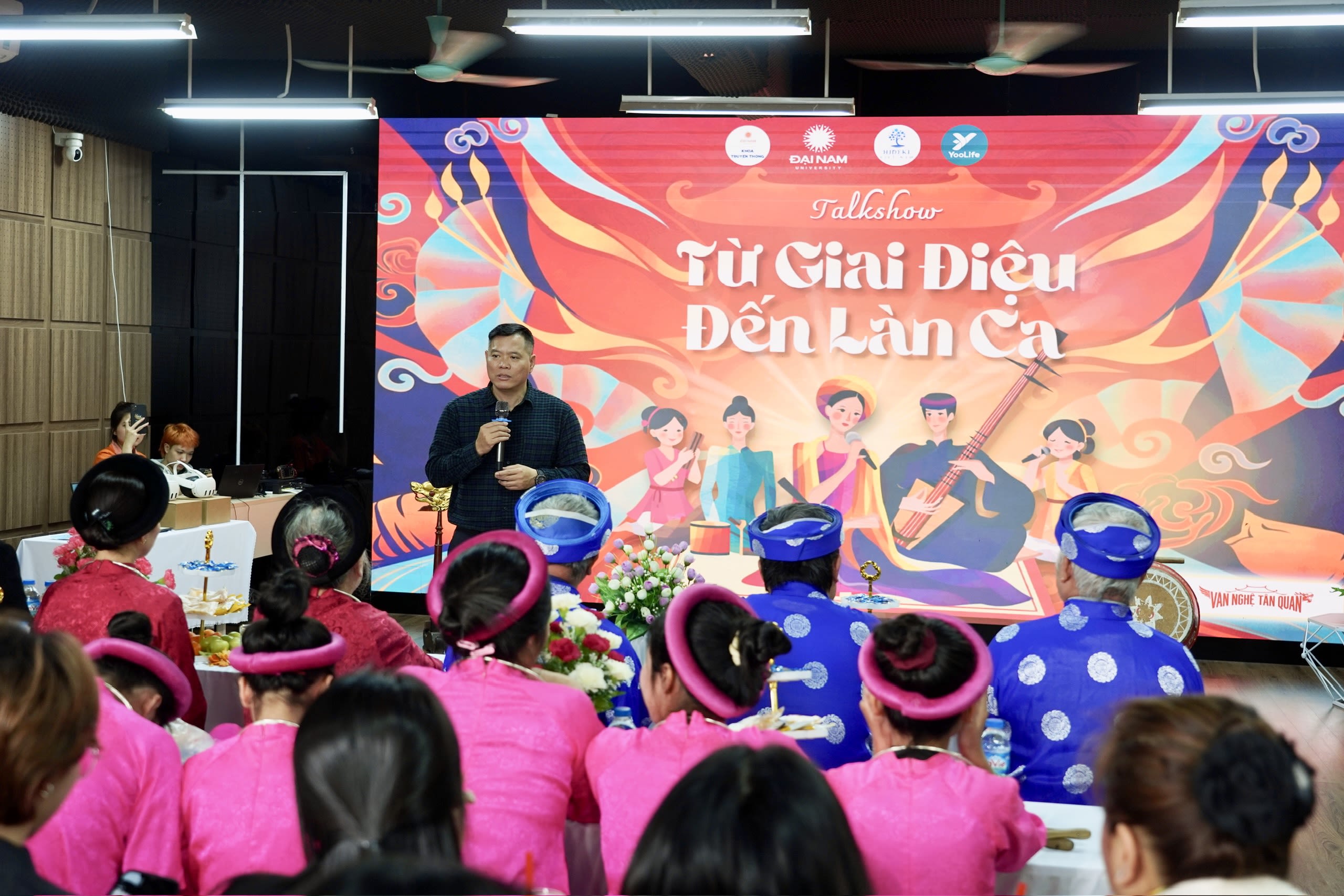 Từ thực tiễn đó, nhóm sinh viên trường Đại học Đại Nam đã cho ra đời dự án “ Văn nghệ Tân quan” với mục tiêu quảng bá và lan toả những nét đẹp trong văn hoá - nghệ thuật Việt đến giới trẻ thông qua nền tảng mạng xã hội. Và talkshow “Từ giai điệu đến làn ca” được tổ chức như một diễn đàn mở, nơi di sản và công nghệ cùng hiện diện trong một không gian đối thoại. Tại chương trình, người tham dự không chỉ được thưởng thức các tiết mục ca trù trực tiếp, mà còn được lắng nghe những chia sẻ về giá trị, thực trạng và con đường tiếp nối của loại hình nghệ thuật truyền thống này trong bối cảnh chuyển đổi số.