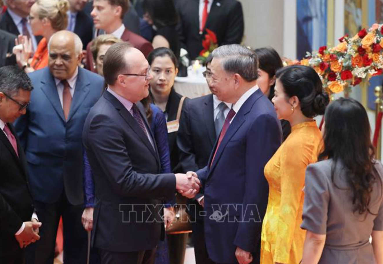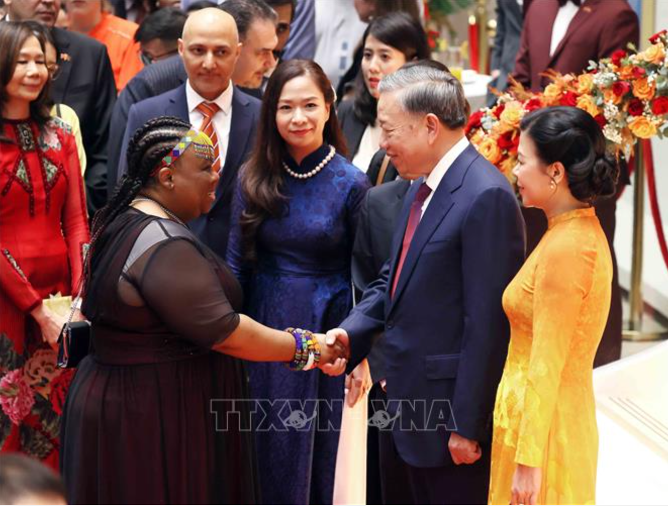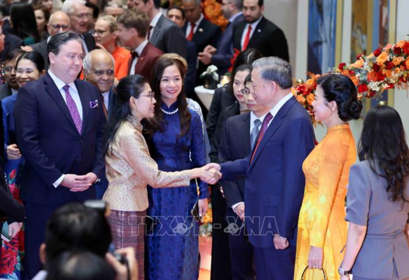 Tổng Bí thư, Chủ tịch nước Tô Lâm và Phu nhân đón các đại sứ, đại biện, trưởng đại diện các tổ chức quốc tế đến dự. Ảnh: TTXVN