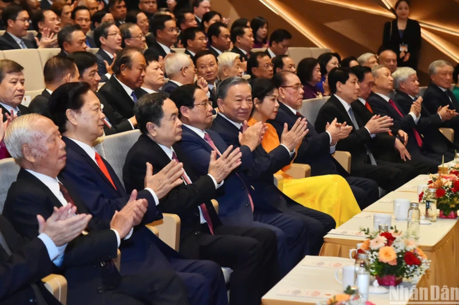 Các đồng chí lãnh đạo, nguyên lãnh đạo Đảng và Nhà nước tham dự Lễ Kỷ niệm. (Ảnh: THỦY NGUYÊN)