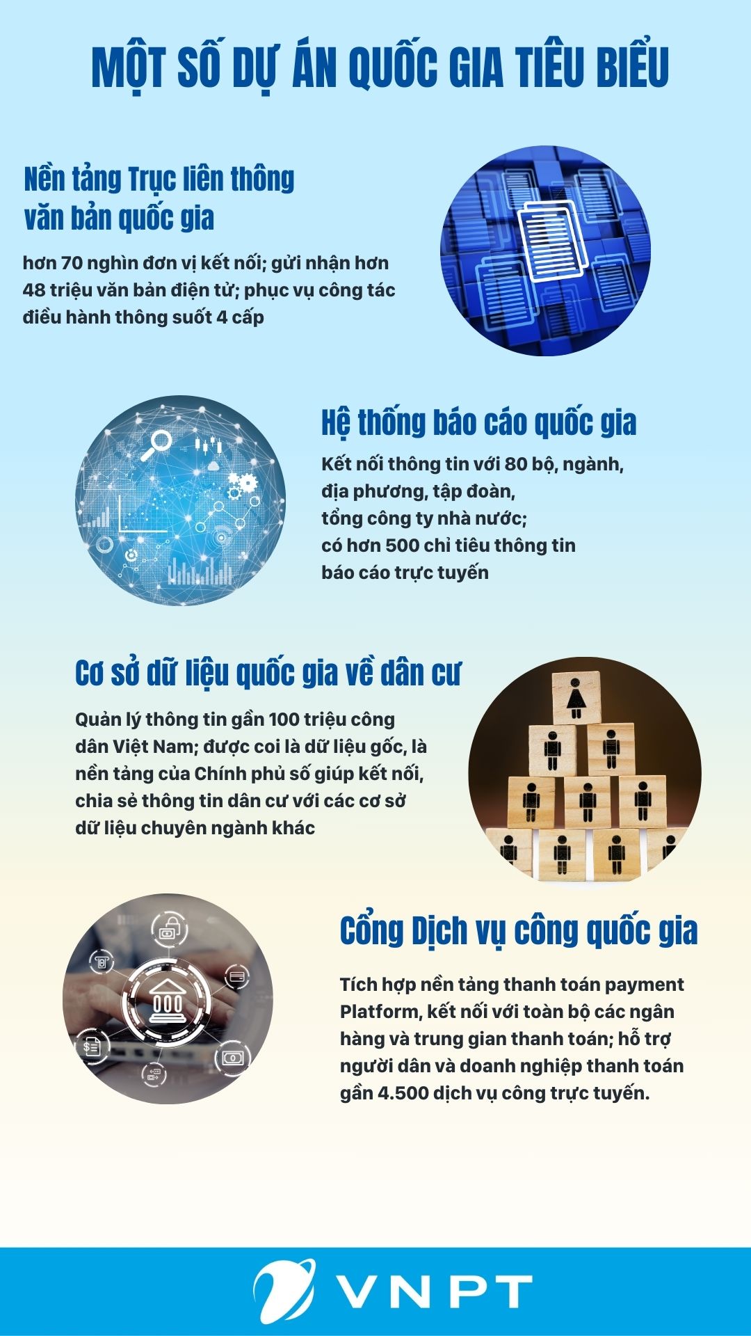 Tính đến tháng 2/2025, VNPT đã triển khai 11 nền tảng và 6 cơ sở dữ liệu quy mô cấp quốc gia. Các nền tảng số do VNPT phát triển đã được ứng dụng trong nhiều giải pháp chuyển đổi số tại 63 tỉnh/thành phố và nhiều cơ quan bộ, ngành.