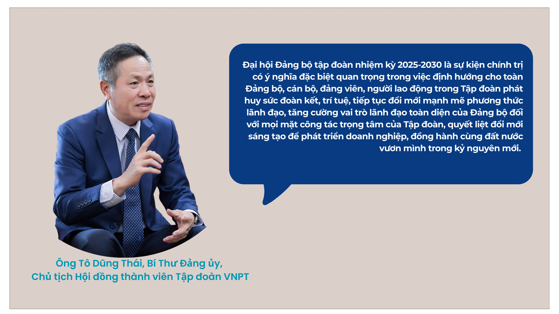 Với khẩu hiệu hành động “Đoàn kết - Dân chủ - Kỷ cương - Đột phá - Phát triển" và mục tiêu “Đổi mới mạnh mẽ phương thức lãnh đạo, xây dựng Đảng bộ Tập đoàn trong sạch, vững mạnh toàn diện; đột phá trong phát triển doanh nghiệp; khẳng định vai trò chủ lực của tập đoàn công nghệ tiên phong, đồng hành cùng đất nước vươn mình trong kỷ nguyên số”, tháng 5/2025, Đại hội Đảng bộ Tập đoàn VNPT lần thứ 25, nhiệm kỳ 2025-2030 đã được tổ chức thành công.