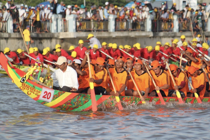 Sau lễ cúng, miếng vải đỏ tượng trưng cho nữ thần Neng Khmau được đặt lên mũi ghe trong suốt cuộc đua. Các tay đua lên ghe theo vị trí đã được sắp xếp rồi đồng loạt vung tay chèo theo tiếng còi của huấn luyện viên. Chiếc ghe xé nước lao đi vun vút trong tiếng hò reo của những người theo dõi.