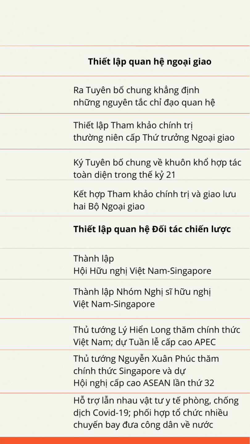 Việt Nam và Singapore chính thức thiết lập quan hệ ngoại giao năm 1973. Sau khi nâng tầm quan hệ lên Đối tác chiến lược năm 2013, quan hệ giữa hai nước ngày càng phát triển sâu rộng và đạt hiệu quả cao. Trải qua nửa thế kỷ, quan hệ Việt Nam và Singapore càng trở nên gắn bó, với độ tin cậy cao và hợp tác giữa hai nước thu được nhiều kết quả tích cực.