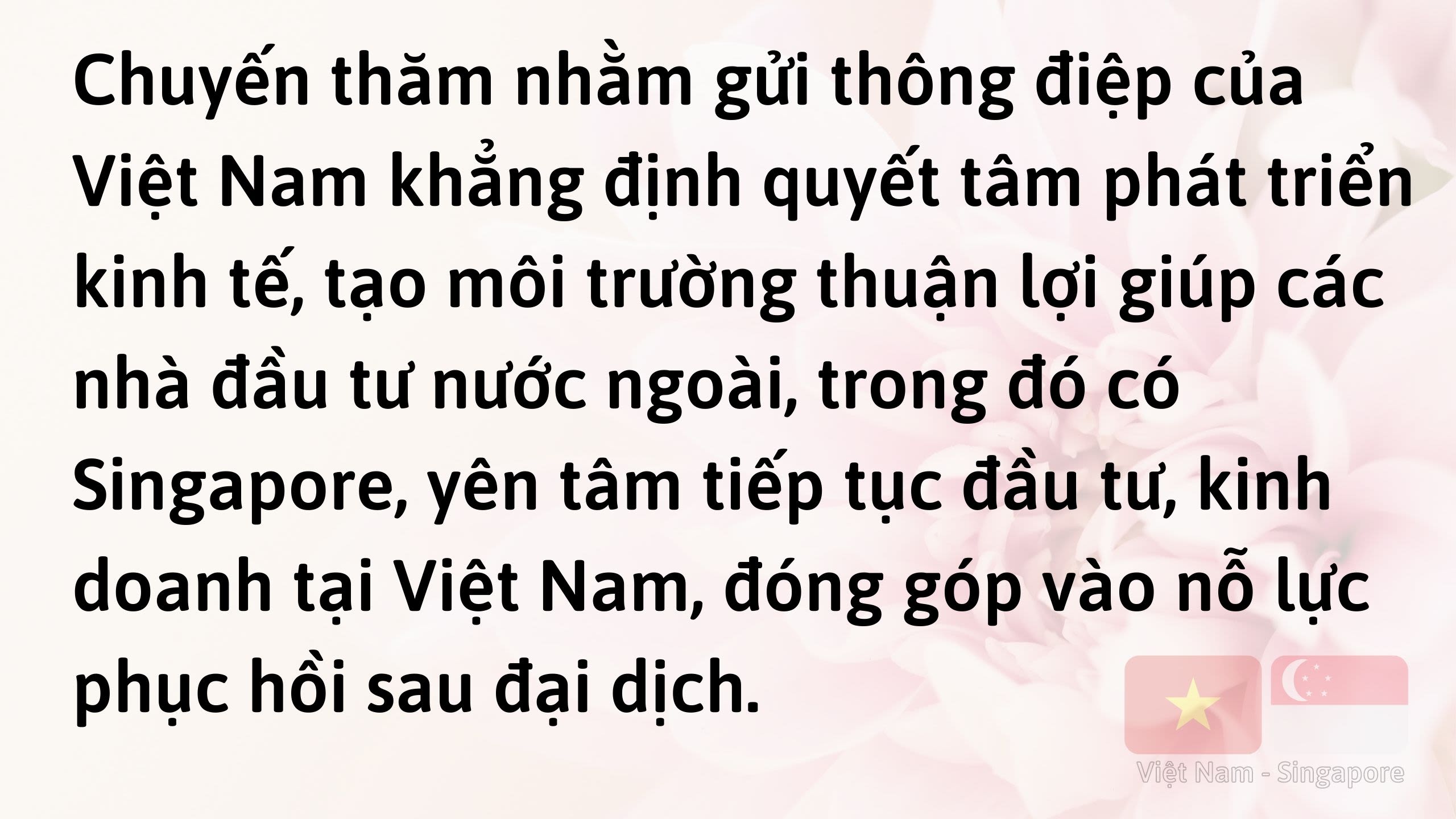 Nền kinh tế Việt Nam không chỉ phục hồi mà sẽ phục hồi mạnh mẽ trong năm 2022. Nhiều công ty, tập đoàn Singapore sẽ tiếp tục nắm bắt cơ hội tại thị trường Việt Nam và góp phần thúc đẩy sự phát triển của nền kinh tế Việt Nam.