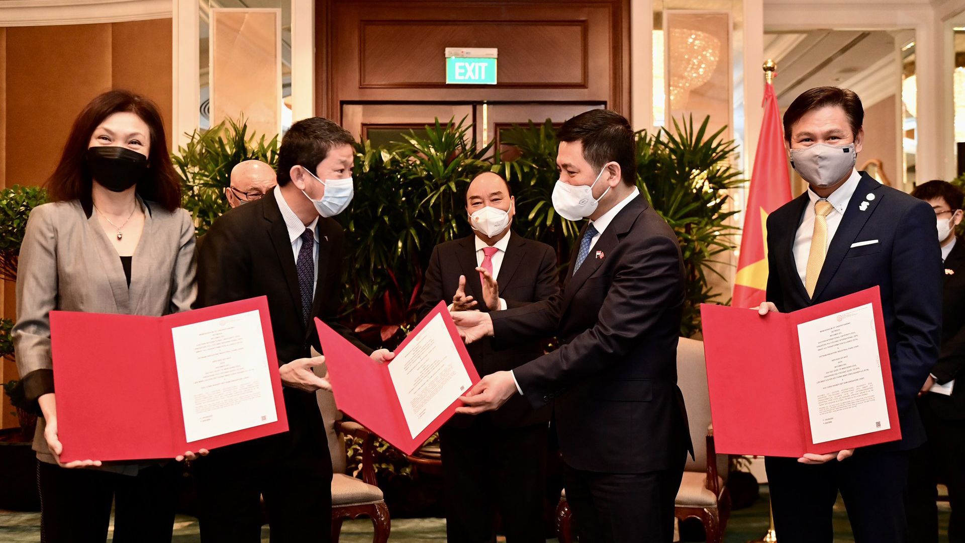 Chủ tịch nước Nguyễn Xuân Phúc chứng kiến việc trao giấy phép đầu tư vào Việt Nam cho các doanh nghiệp Singapore.