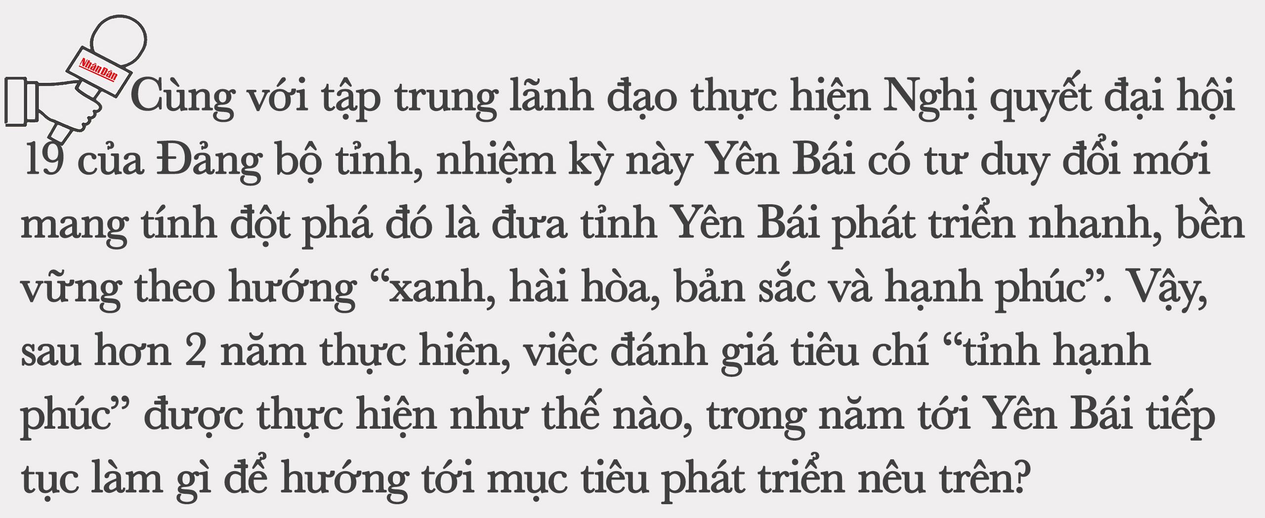 "Năm 2022, tỉnh Yên Bái tổ chức cuộc khảo sát quy mô lớn với 12.320 phiếu đánh giá về chỉ số hạnh phúc của người dân. Qua khảo sát, chỉ số hạnh phúc của người dân Yên Bái năm 2022 là 62,57%, tăng 4,46% so với năm 2021, vượt 1,37% so với kế hoạch (tăng 9,27% so với đầu nhiệm kỳ), đạt mức 2- khá hạnh phúc", đồng chí Đỗ Đức Duy, Ủy viên Trung Đảng, Bí thư Tỉnh ủy Yên Bái trả lời phỏng vấn của Báo Nhân Dân nhân dịp đầu năm mới 2023.