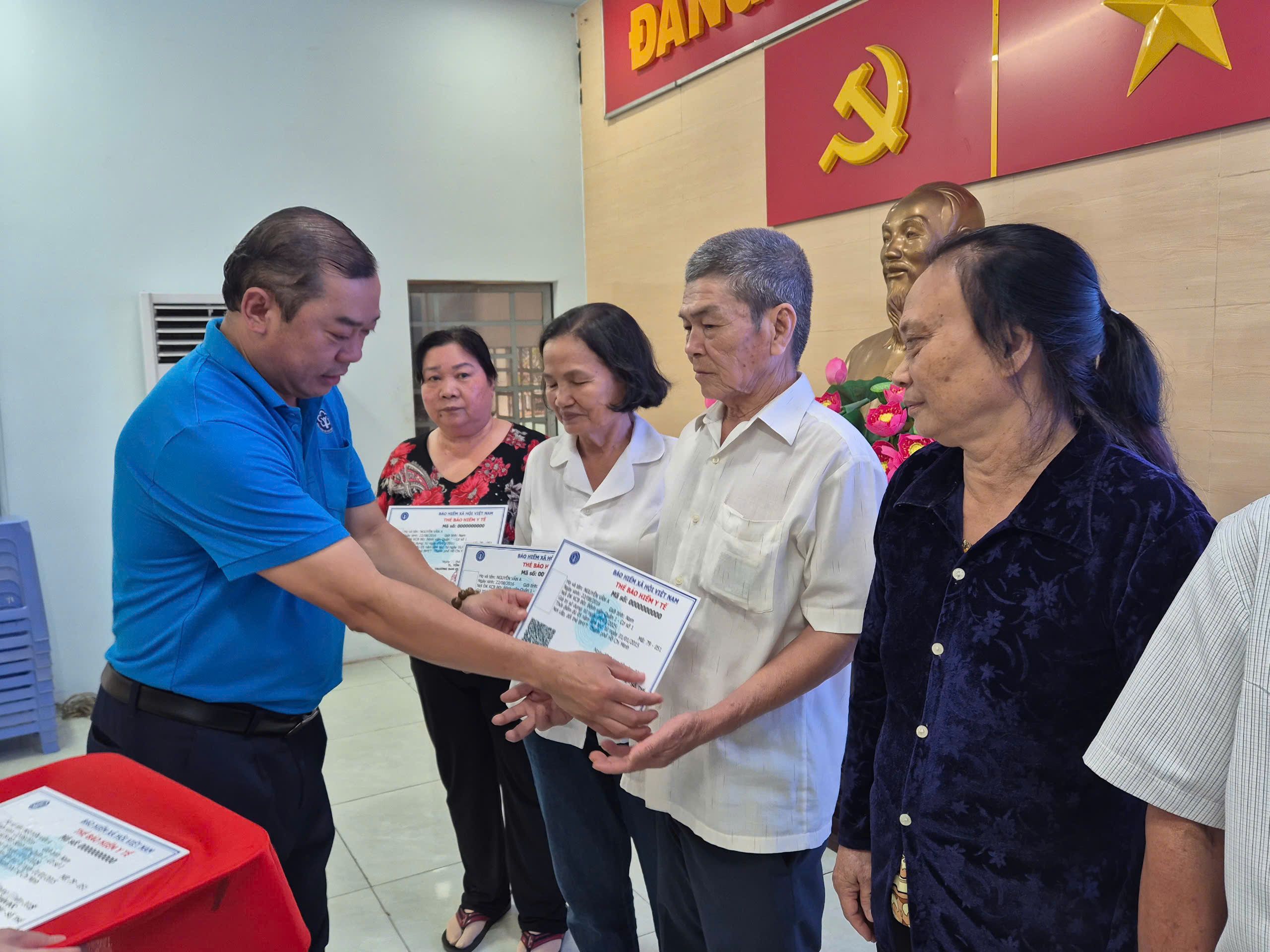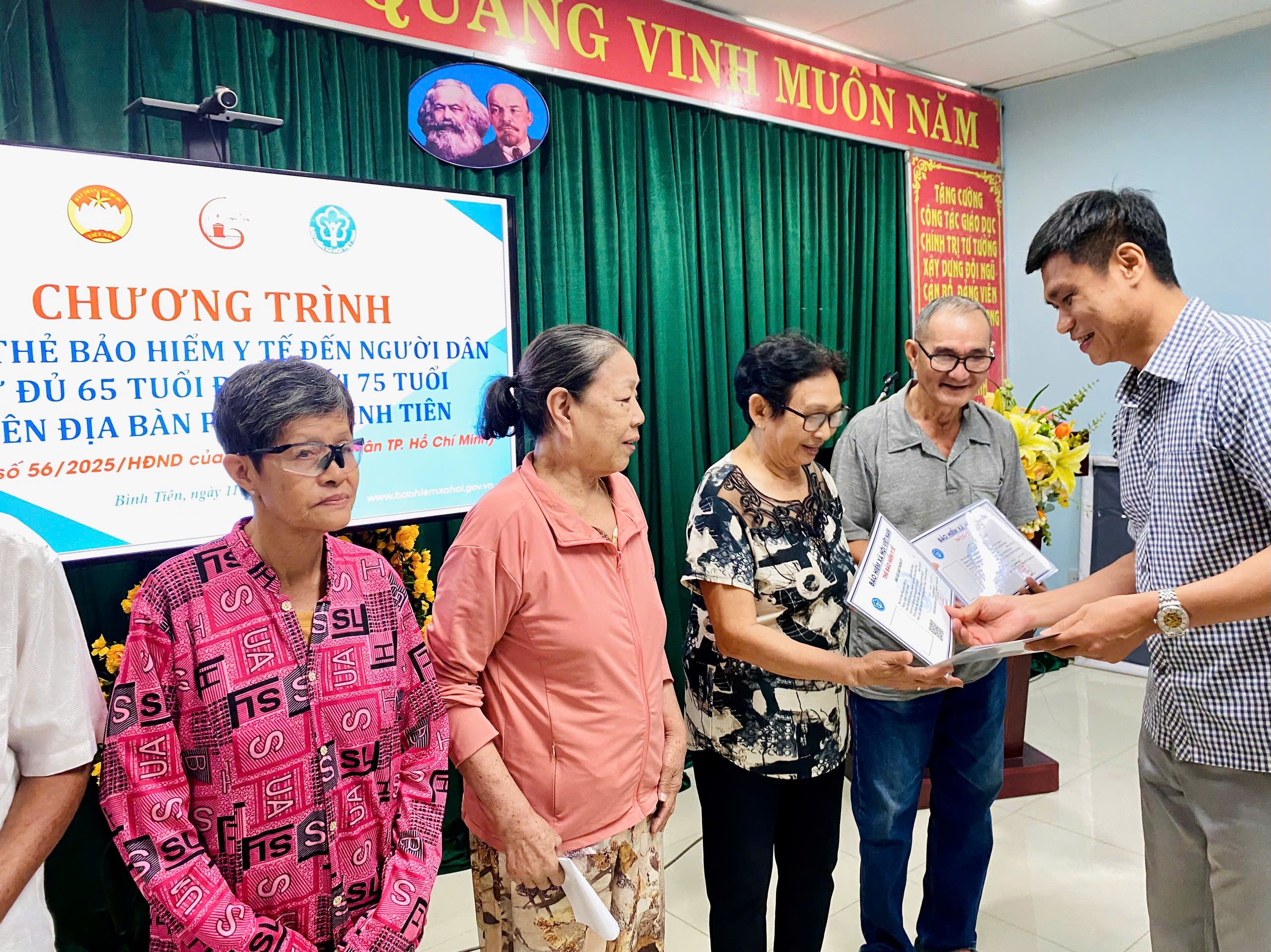 Phó Giám đốc Bảo hiểm xã hội cơ sở Thới An, Thành phố Hồ Chí Minh Mai Văn Thủy trao thẻ Bảo hiểm y tế cho người từ đủ 65 tuổi đến dưới 75 tuổi phường Trung Mỹ Tây.