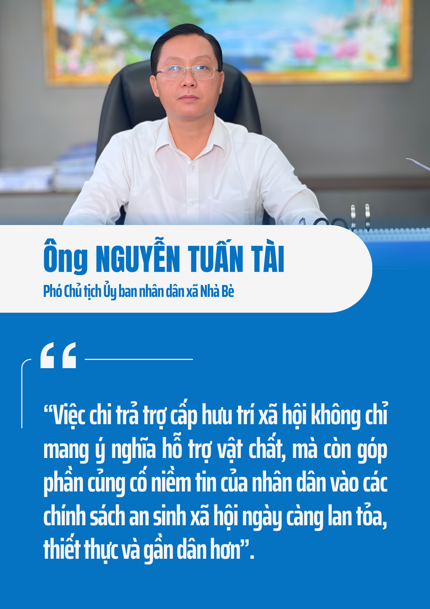 Như tại xã Nhà Bè, theo Ủy ban nhân dân xã Nhà Bè, trên địa bàn hiện có 504 trường hợp từ đủ 75 tuổi trở lên được hưởng mức trợ cấp này. Việc chi trả được thực hiện trên cơ sở người dân đăng ký, sau khi cơ quan Bảo hiểm xã hội xác nhận đủ điều kiện. Khoản trợ cấp tuy không lớn, nhưng với nhiều người cao tuổi, đó là nguồn động viên thiết thực, giúp họ có thêm chi phí sinh hoạt, thuốc men, giảm bớt sự phụ thuộc vào con cháu.