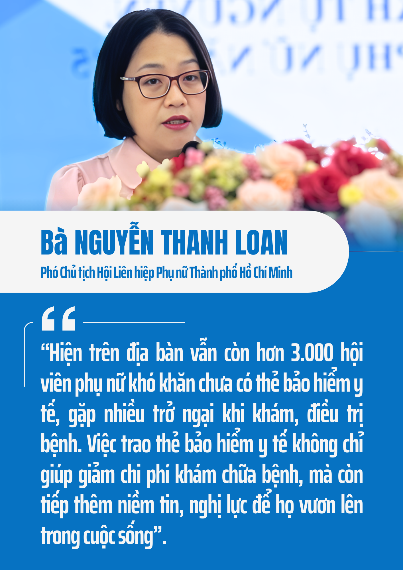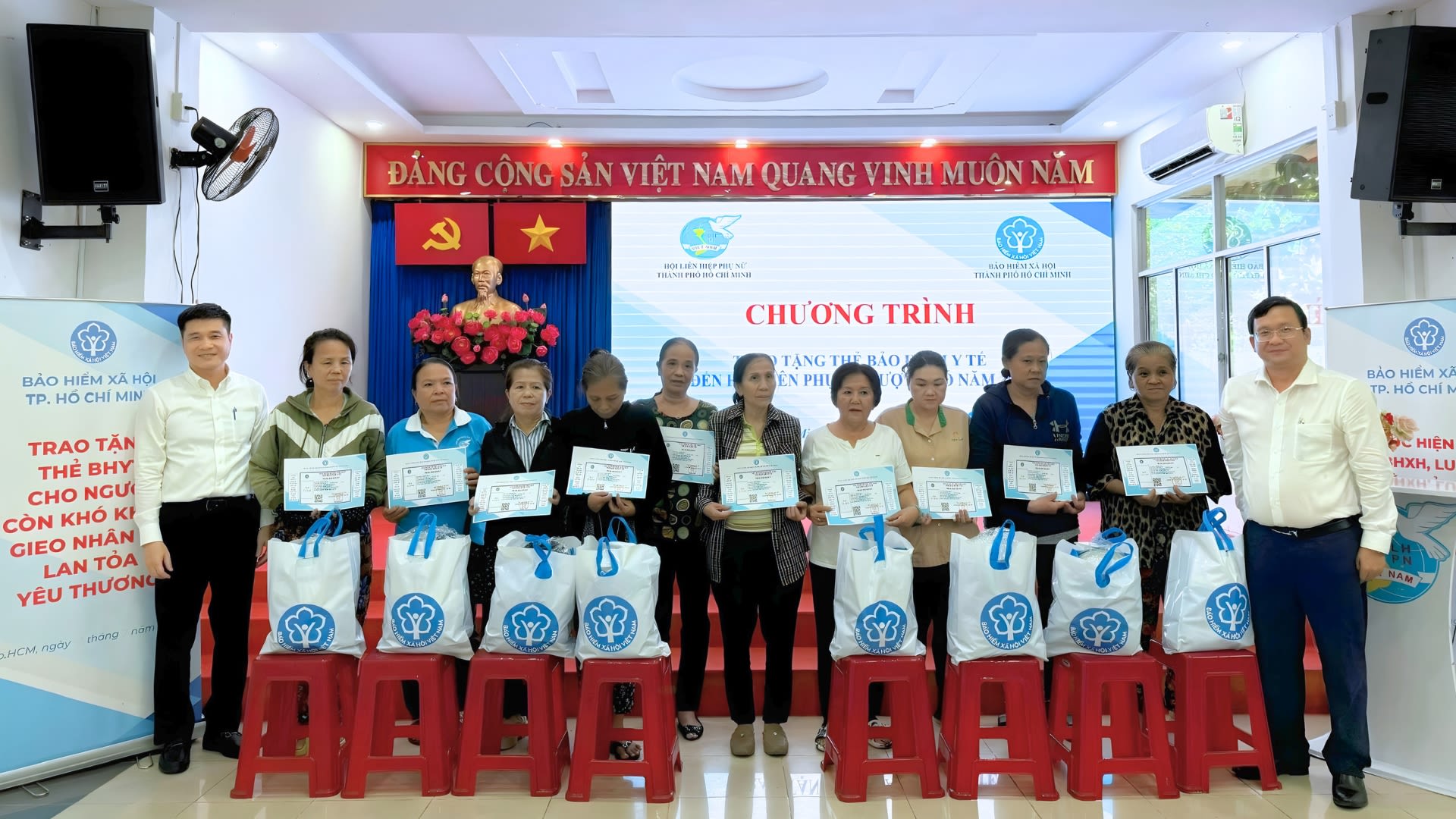 Bảo hiểm xã hội Thành phố Hồ Chí Minh phối hợp với Uỷ ban Mặt trận Tổ quốc Việt Nam Thành phố Hồ Chí Minh và Hội Liên hiệp Phụ nữ Thành phố trao thẻ bảo hiểm y tế cho các hội viên phụ nữ có hoàn cảnh khó khăn.