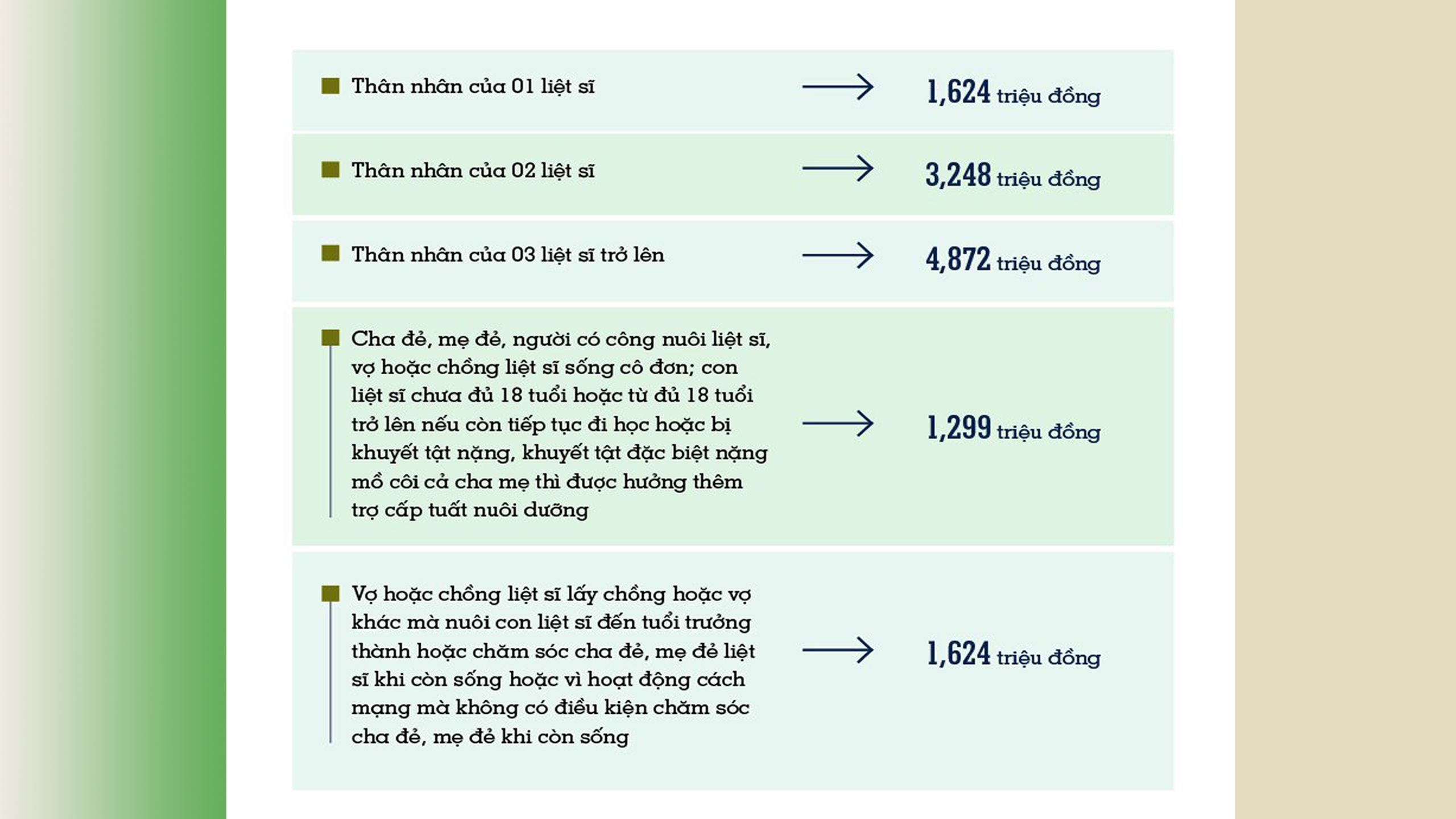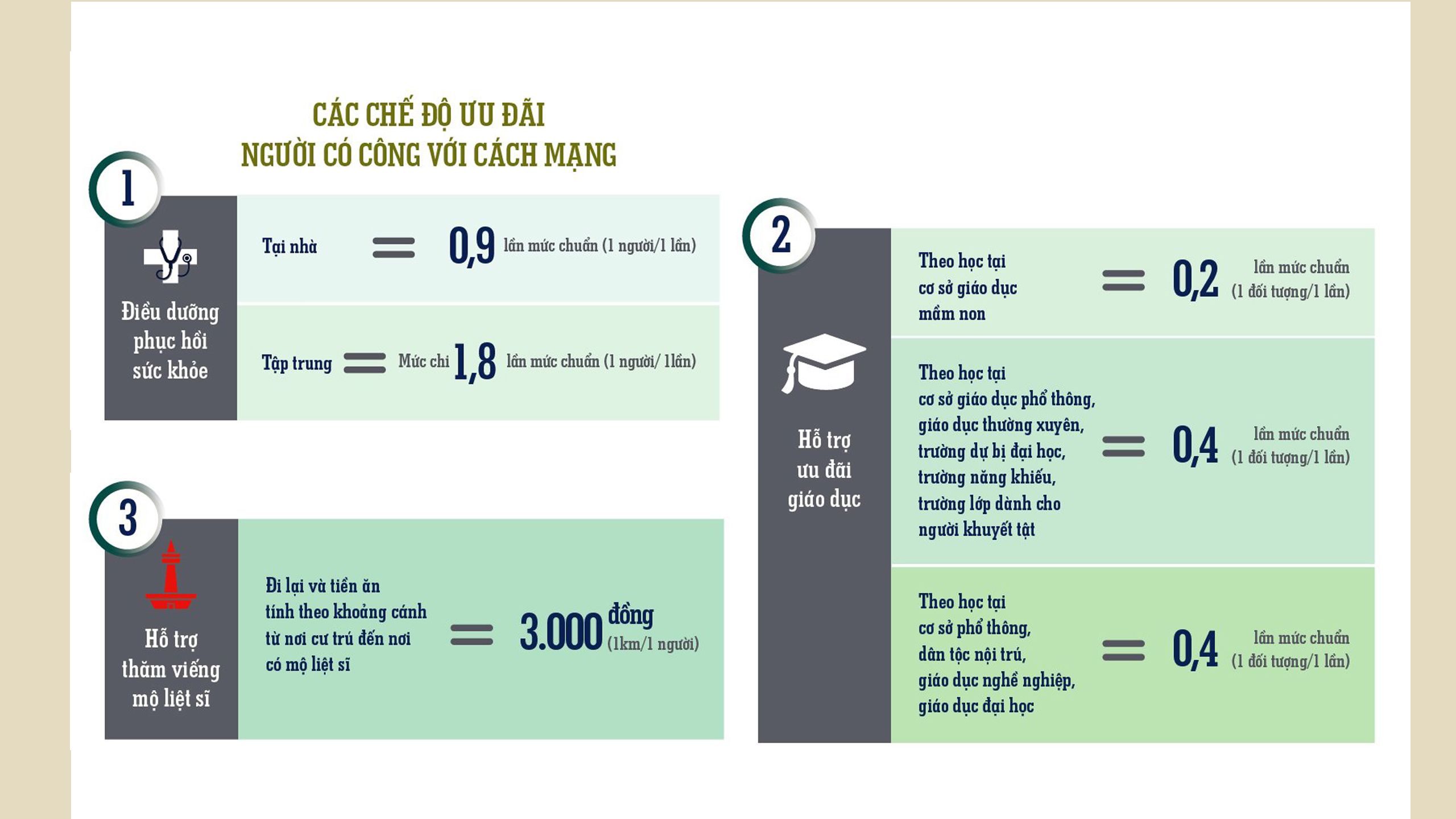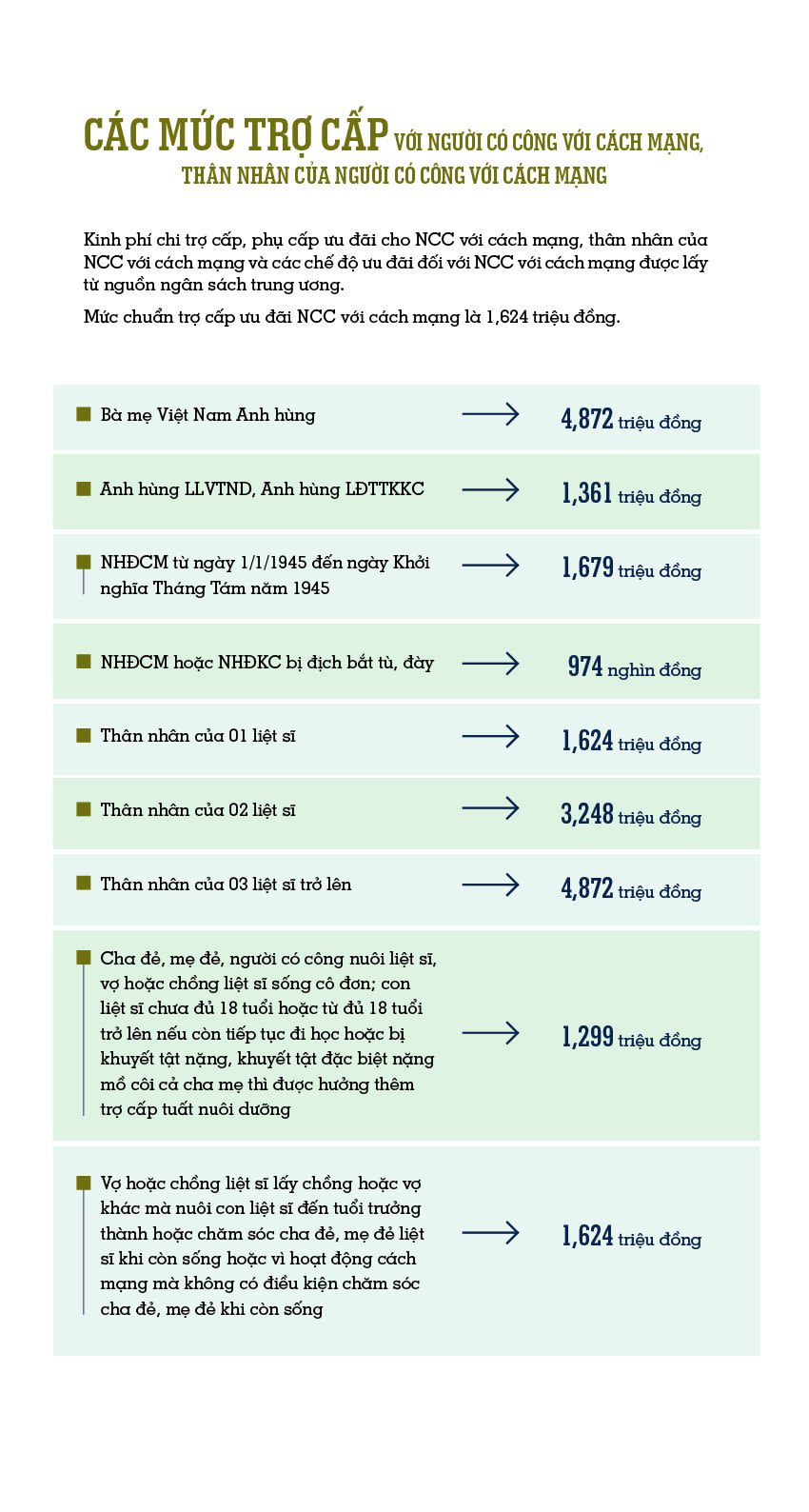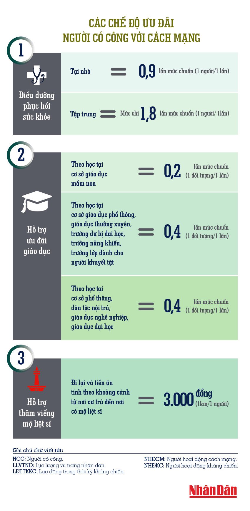 Đặc biệt, mức hưởng trợ cấp ưu đãi hằng tháng đối với Bà mẹ Việt Nam Anh hùng bằng 3 lần mức chuẩn, tương đương 4,872 triệu đồng. Anh hùng Lực lượng vũ trang nhân dân, Anh hùng Lao động trong thời kỳ kháng chiến là 1,361 triệu đồng; Người hoạt động cách mạng từ ngày 1 tháng 1 năm 1945 đến Ngày khởi nghĩa Tháng Tám năm 1945 là 1,679 triệu đồng; Người hoạt động cách mạng hoặc hoạt động kháng chiến bị địch bắt tù, đày là 974.000 đồng.