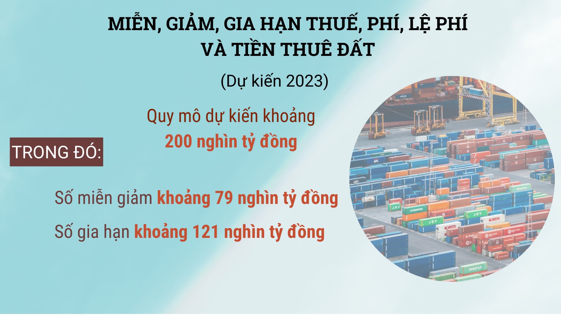 Công tác quản lý chi ngân sách Nhà nước chặt chẽ, triệt để tiết kiệm chi thường xuyên. Đã tham mưu, đề xuất trình Quốc hội, Chính phủ, Thủ tướng Chính phủ ban hành nhiều chính sách miễn, giảm, gia hạn thuế, phí, lệ phí và tiền thuê đất trong năm 2023 với quy mô dự kiến khoảng 200 nghìn tỷ đồng (miễn, giảm khoảng 79 nghìn tỷ đồng, gia hạn khoảng 121 nghìn tỷ đồng).