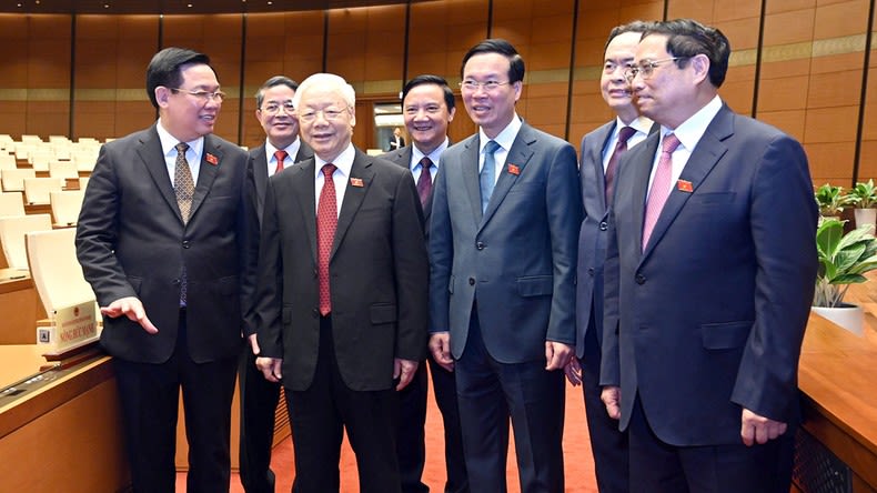 Tổng Bí thư Nguyễn Phú Trọng, Chủ tịch nước Võ Văn Thưởng, Thủ tướng Phạm Minh Chính cùng các đồng chí lãnh đạo Đảng, Nhà nước và các đại biểu Quốc hội tại phiên khai mạc sáng 22/5.
