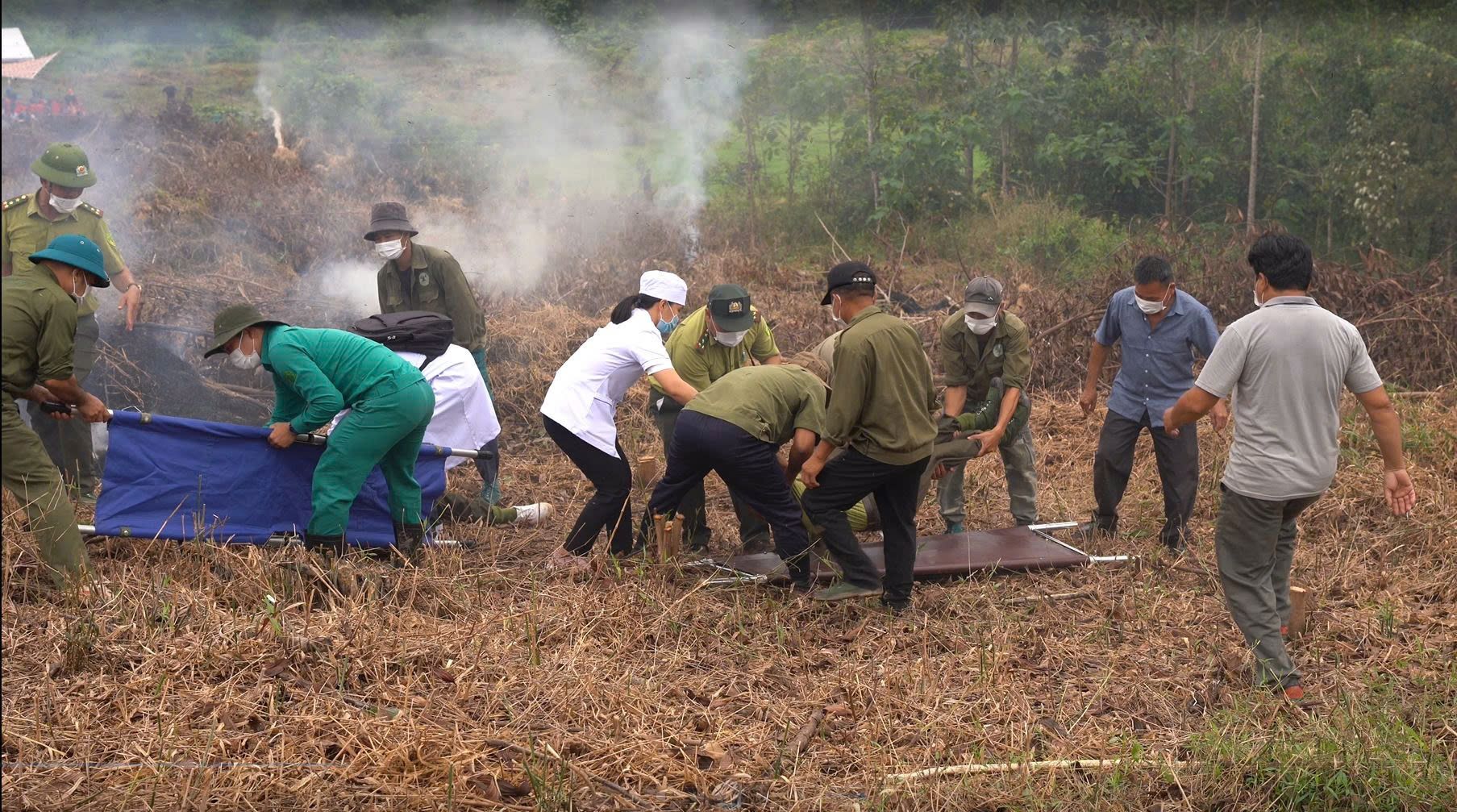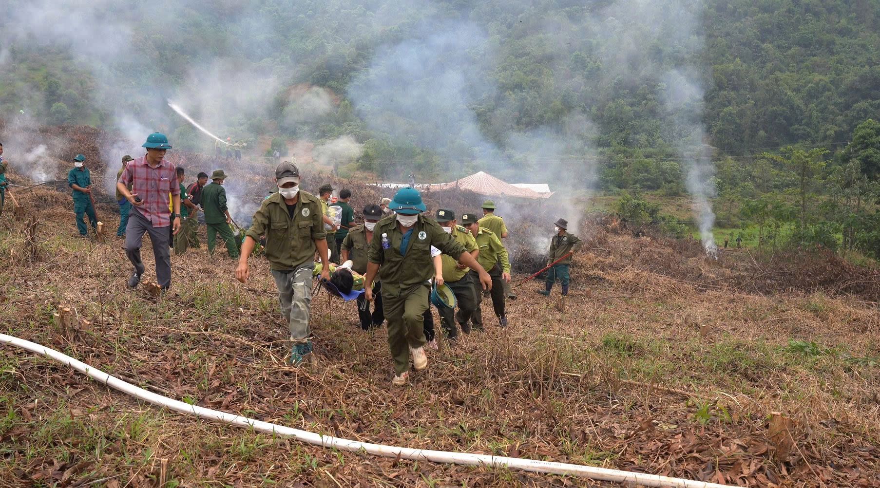 Diễn tập tình huống sơ cấp cứu người bị nạn khi xảy ra sự cố cháy rừng.
