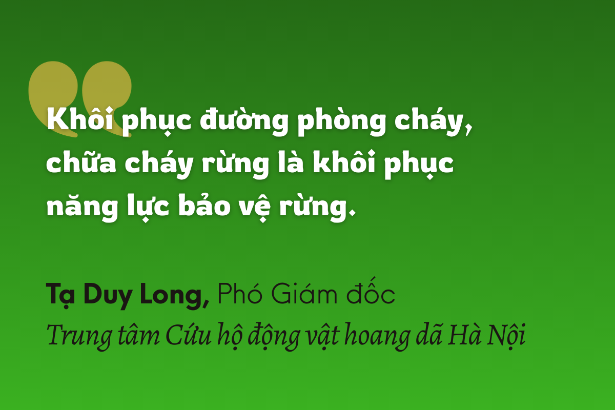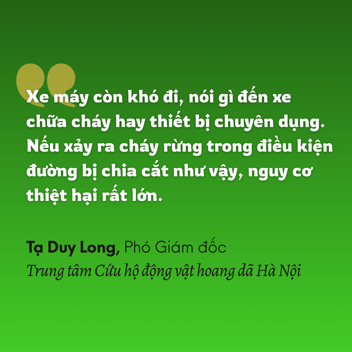 Phó Giám đốc Trung tâm Cứu hộ động vật hoang dã Hà Nội Tạ Duy Long lo ngại: “Xe máy còn khó đi, nói gì đến xe chữa cháy hay thiết bị chuyên dụng. Nếu xảy ra cháy rừng trong điều kiện đường bị chia cắt như vậy, nguy cơ thiệt hại rất lớn”.