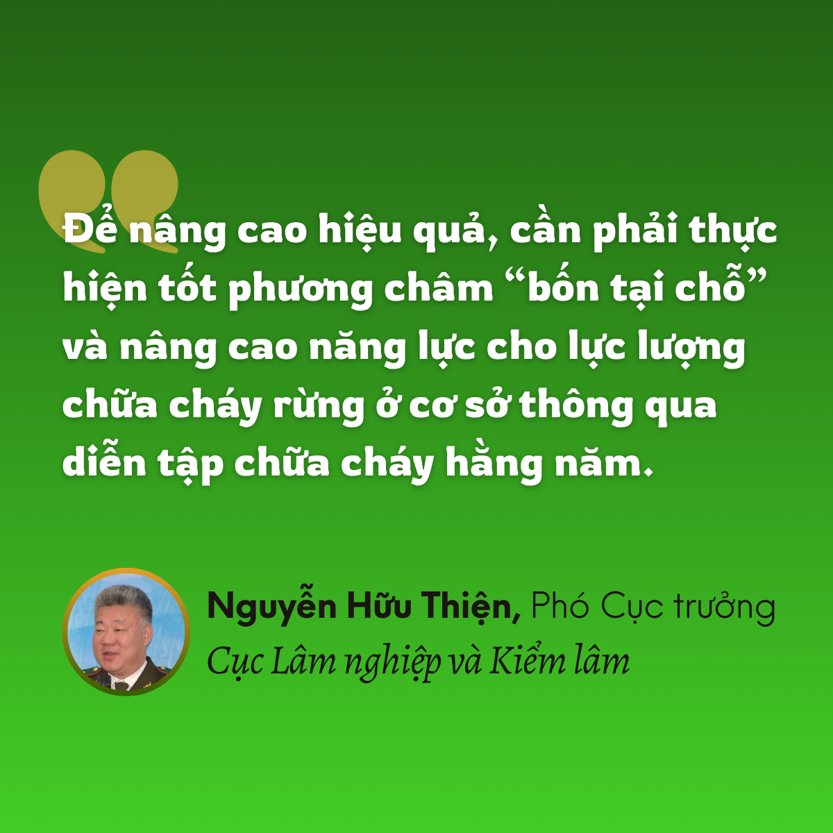 Ông Nguyễn Hữu Thiện, Phó Cục trưởng Cục Lâm nghiệp và Kiểm lâm, Bộ Nông nghiệp và Môi trường, nhấn mạnh nhiệm vụ nòng cốt vẫn là phòng ngừa. Để nâng cao hiệu quả, cần phải thực hiện tốt phương châm “bốn tại chỗ” và nâng cao năng lực cho lực lượng chữa cháy rừng ở cơ sở thông qua diễn tập chữa cháy hằng năm.