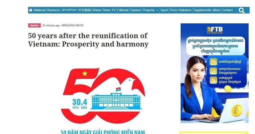 Ngày 21/4, trang tin điện tử của báo Khmer Times đưa bài viết ca ngợi chiến thắng lịch sử 30/4/1975 của Việt Nam với tiêu đề “Việt Nam sau 50 năm sau thống nhất đất nước: Thịnh vượng và hòa hợp” (ảnh chụp màn hình). (Ảnh: TTXVN phát)