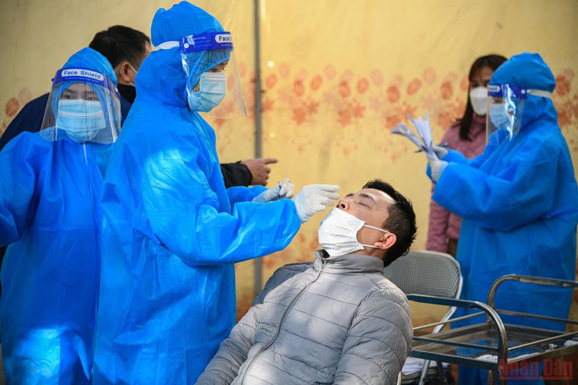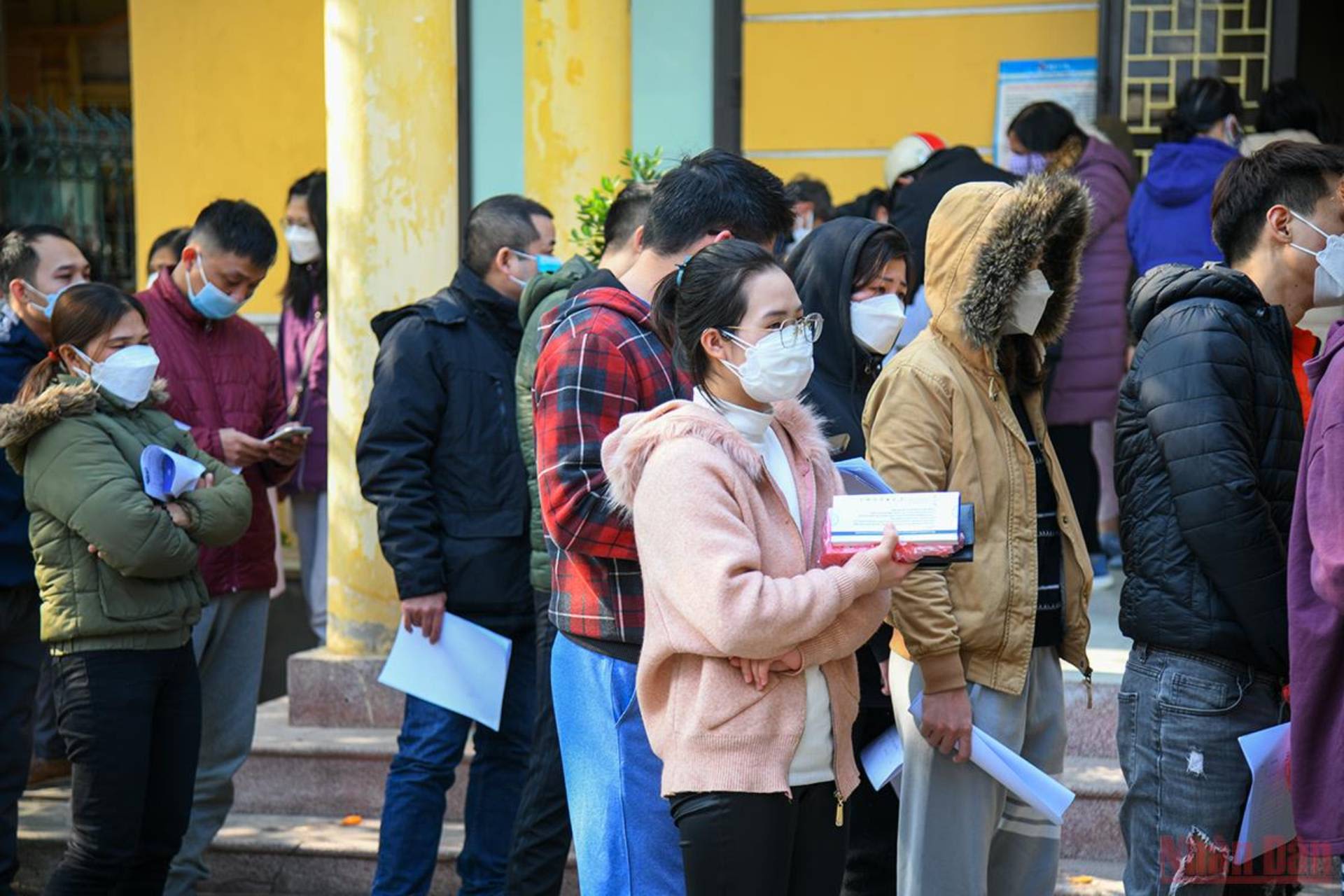 Trước khi có quy định mới, người dân là F0 tại phường Hoàng Liệt, quận Hoàng Mai, Hà Nội phải xếp hàng từ nửa tiếng trở lên để tới lượt lấy mẫu. (Ảnh: THÀNH ĐẠT)