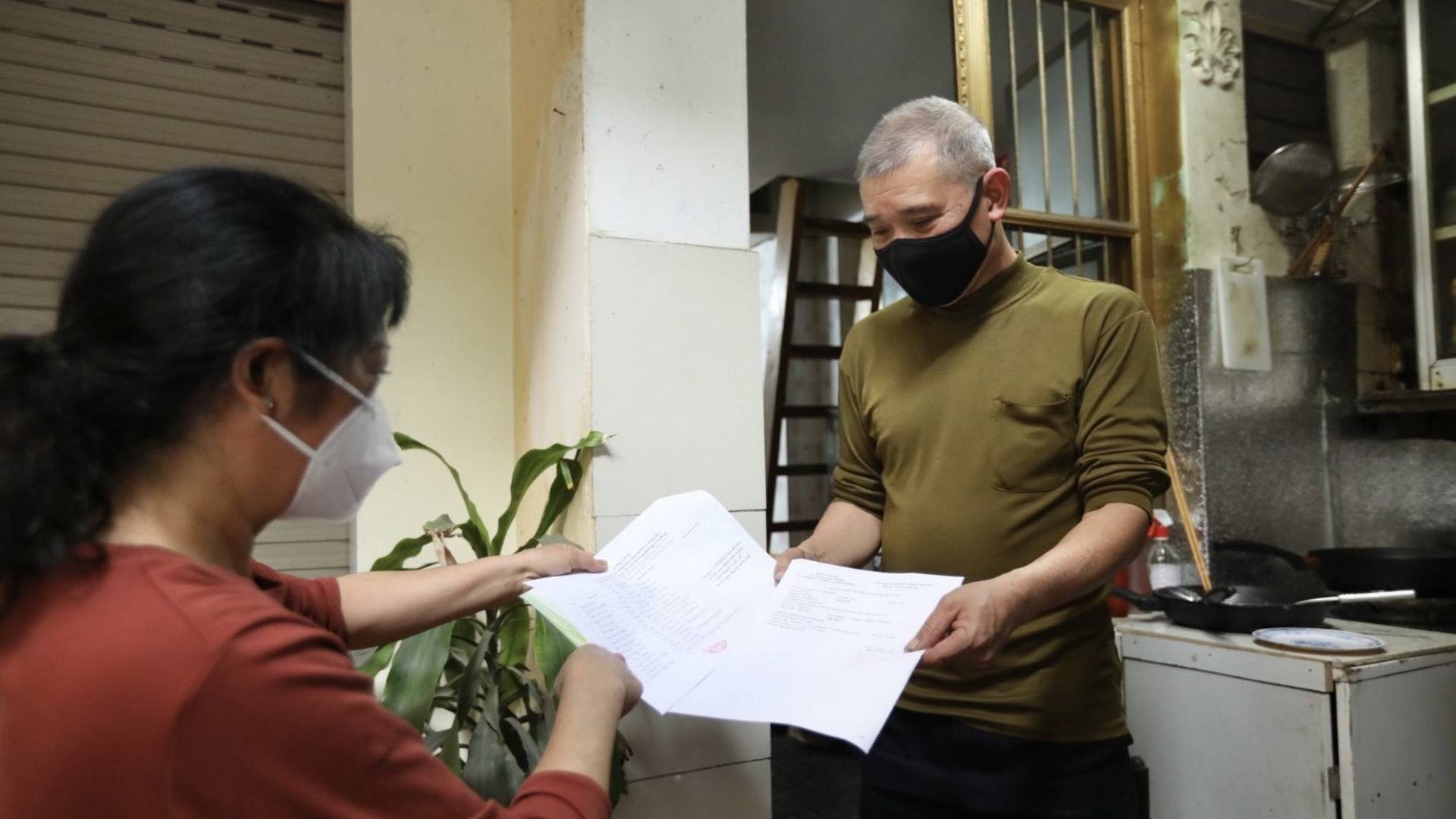 Bà Nguyễn Thị Thanh Hiền, Tổ phó tổ dân phố số 3, phường Cửa Đông, quận Hoàn Kiếm, Hà Nội trao giấy chứng nhận cho các trường hợp F0 đã khỏi bệnh điều trị tại nhà. (Ảnh: MINH QUYẾT/TTXVN)