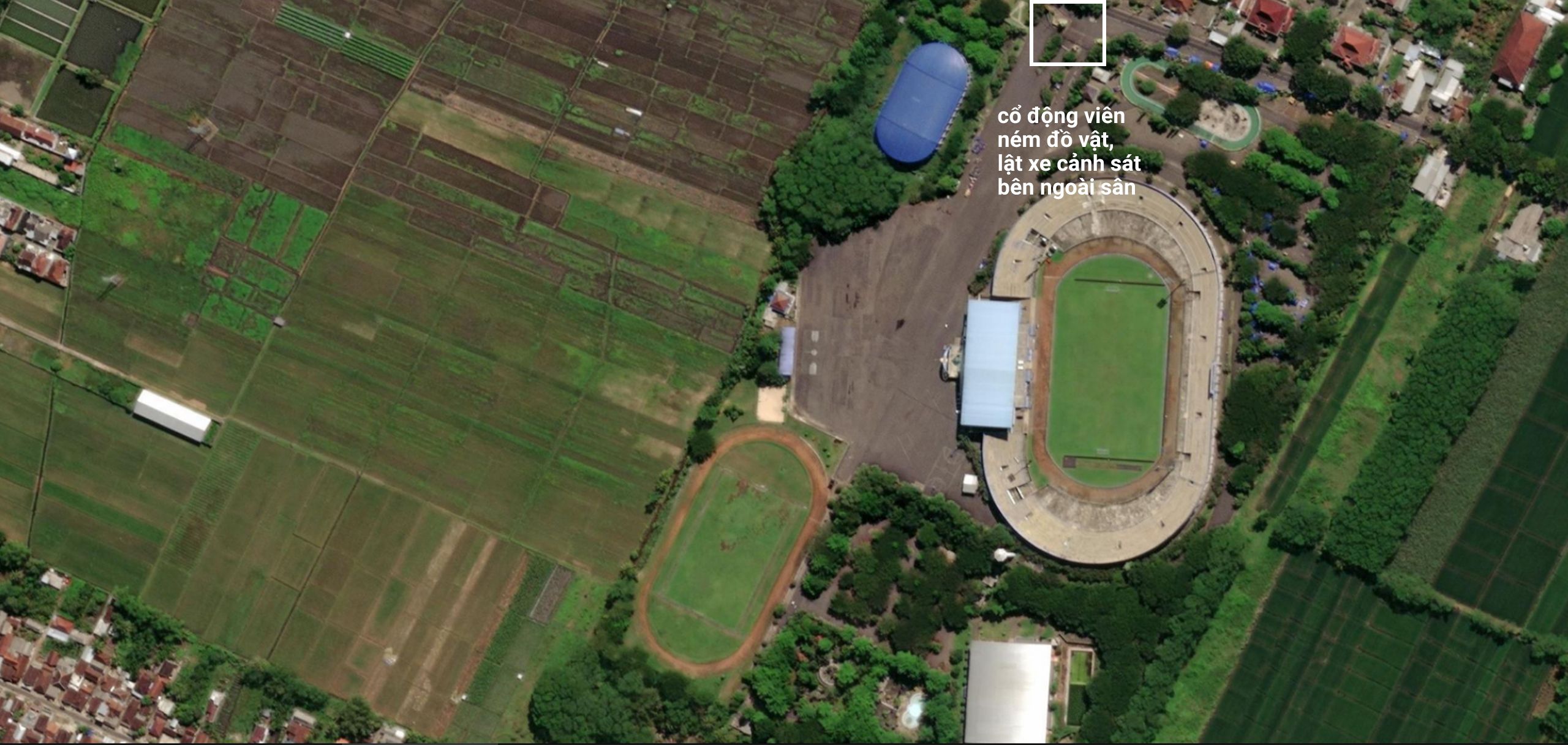 Một số hình ảnh cho thấy xe của cảnh sát bị lật và bốc cháy bên trong sân vận động.