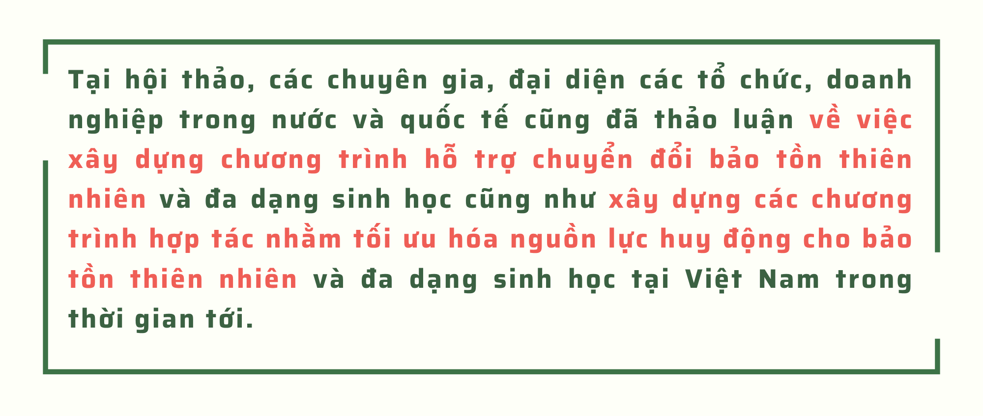Cũng tại hội thảo, các chuyên gia cùng chia sẻ kinh nghiệm thực tế và khuôn khổ chính sách có thể thúc đẩy nền kinh tế bền vững song song với bảo tồn di sản thiên nhiên. Các đại biểu cũng đã tham gia thảo luận về chủ đề “Nền kinh tế dựa vào thiên nhiên và vai trò của thiên nhiên trong việc duy trì sự thịnh vượng của nền kinh tế" và toạ đàm “Xây dựng chương trình hỗ trợ chuyển đổi bảo tồn thiên nhiên và đa dạng sinh học tại Việt Nam”.